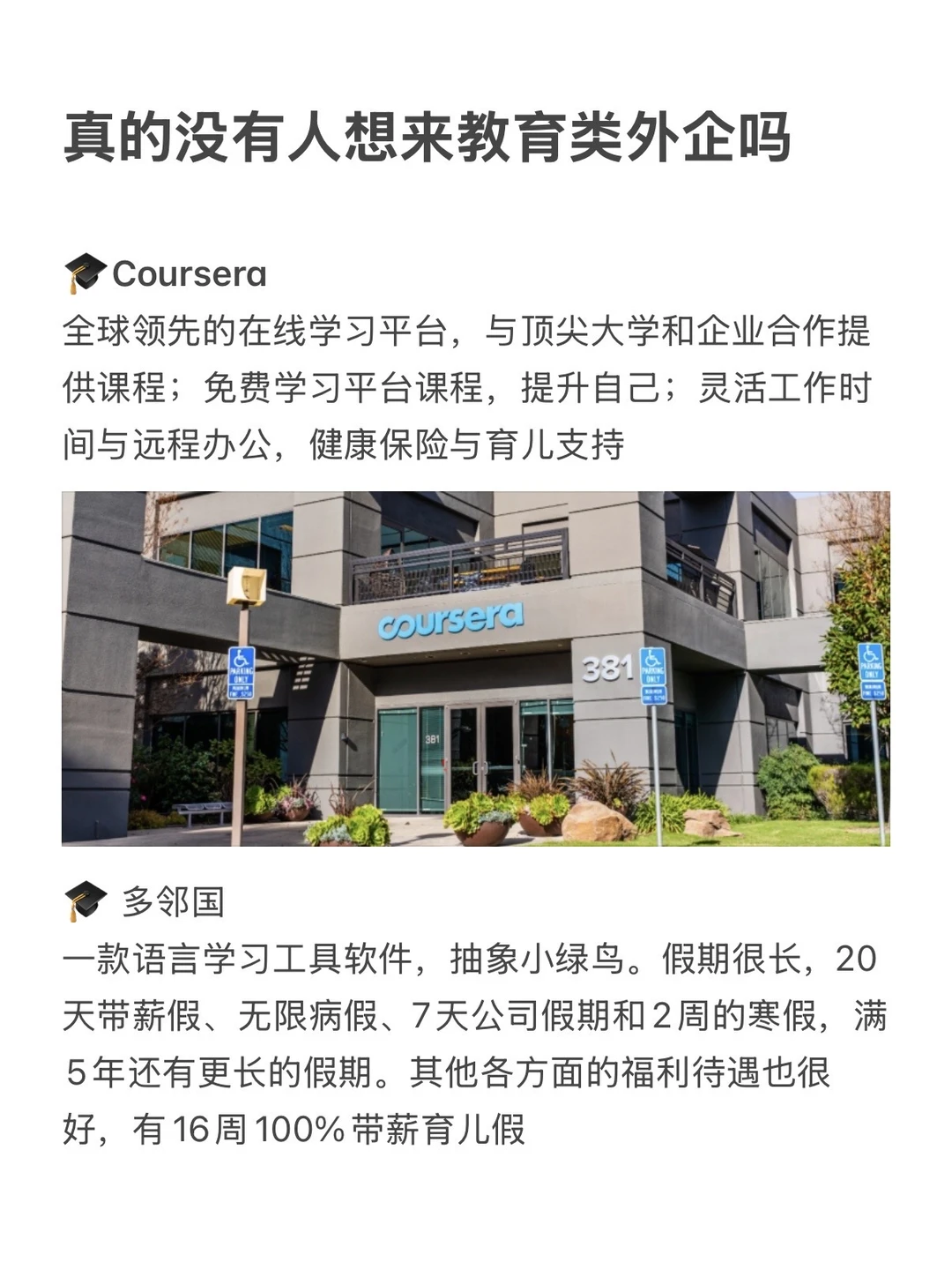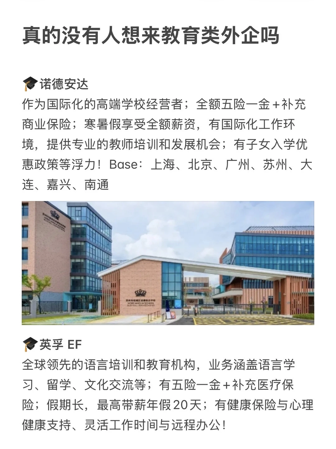 这几年教育的关注点正在从应试转向语言和技能培训,正因如此,教育类外企反而走得越来越稳。福利好+氛围轻松+文科生友好,简直是职场乌托邦!现在机会很多,像教研、行政、市场岗都有。 · 为什么说教育外企值得? ✔️硬核福利: 五险一金+补充医疗,最高有20天带薪年假,保障非常全 ✔️办公自由: 弹性工作+远程办公模式,神仙福利直接拉满 ✔️门槛友好: 不怎么卡专业,沟通能力强就能冲,轻松实现WLB · 坚持日更✊🏻,帮大家在找工作路上顺利拿到 offer! ·