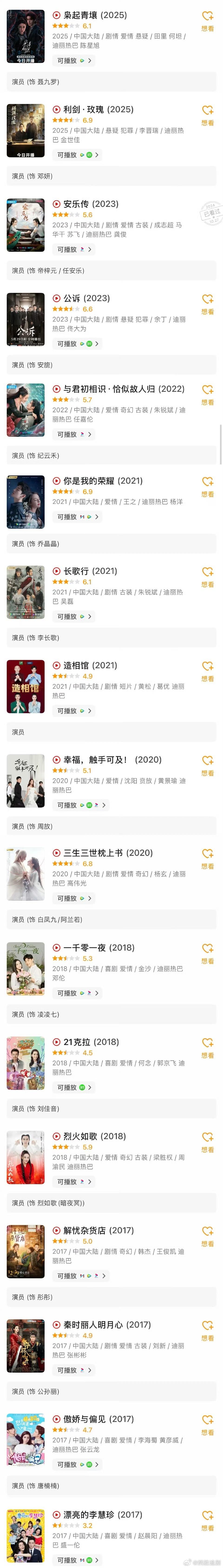 迪丽热巴出道至今,影视作品豆瓣评分没有一部超过7分诶…… 好在综艺作品有。