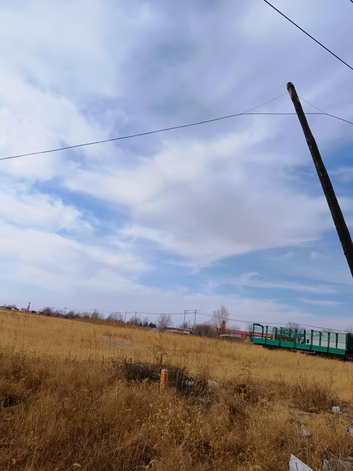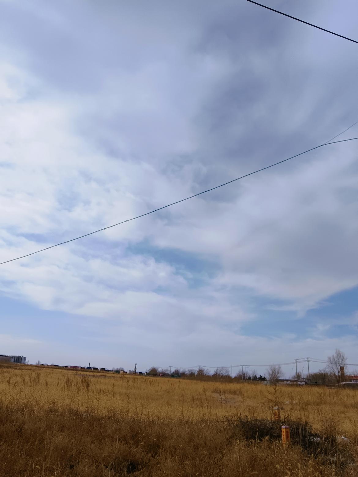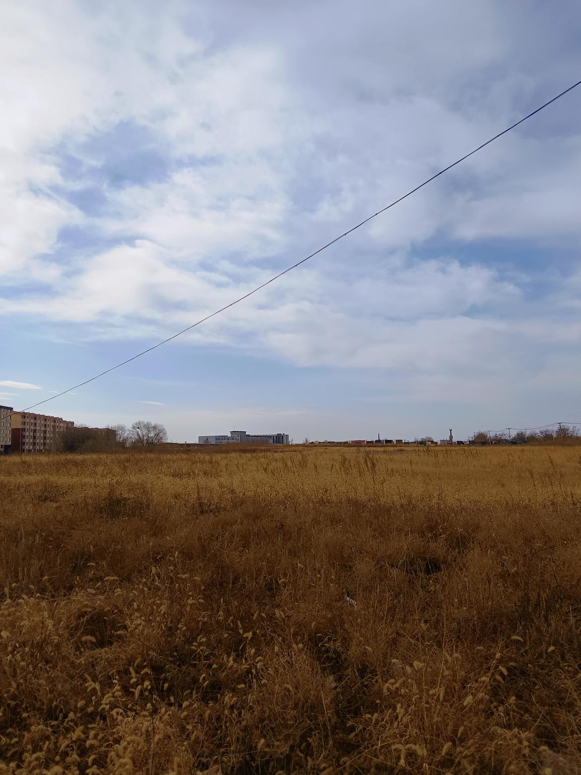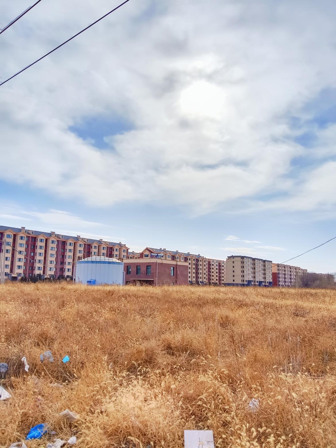 秋日田野,金黄色的草海,远处是城市的轮廓,天空中飘着几朵白云。