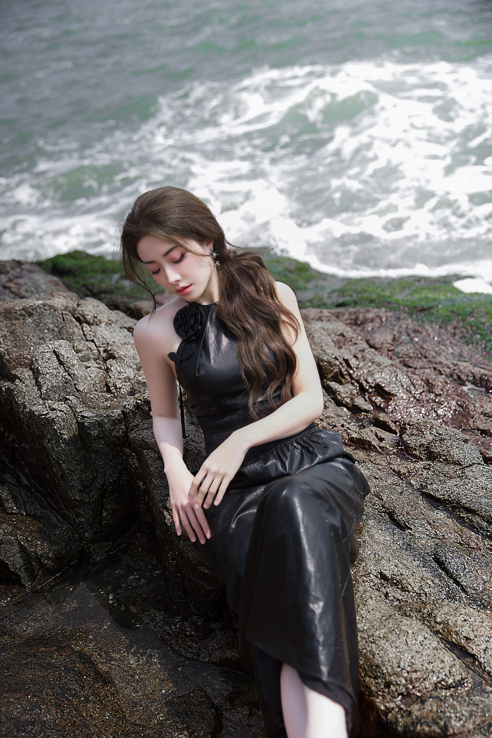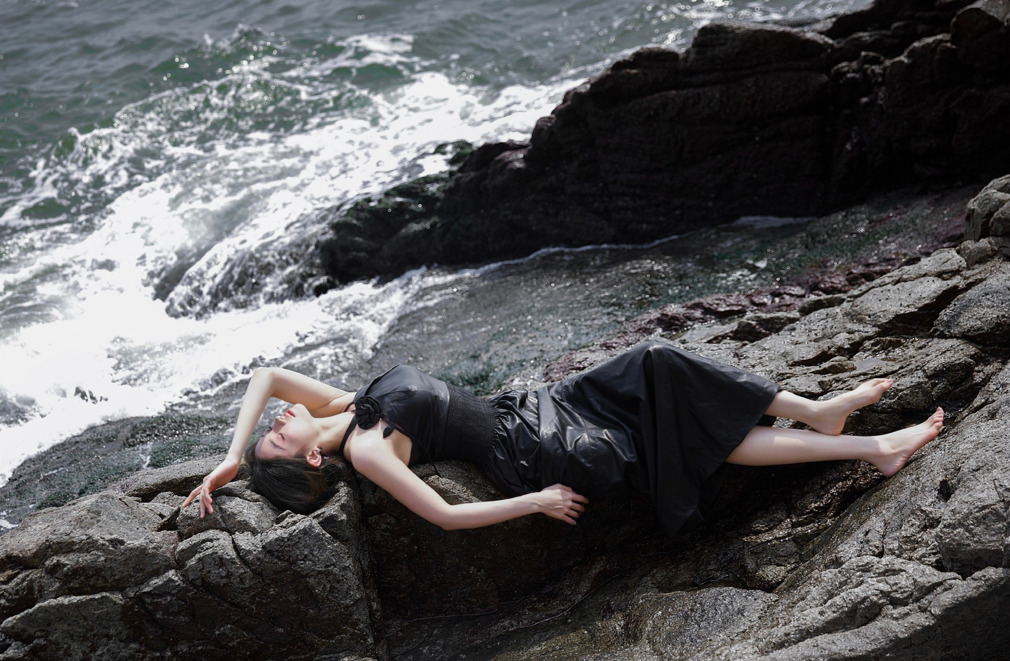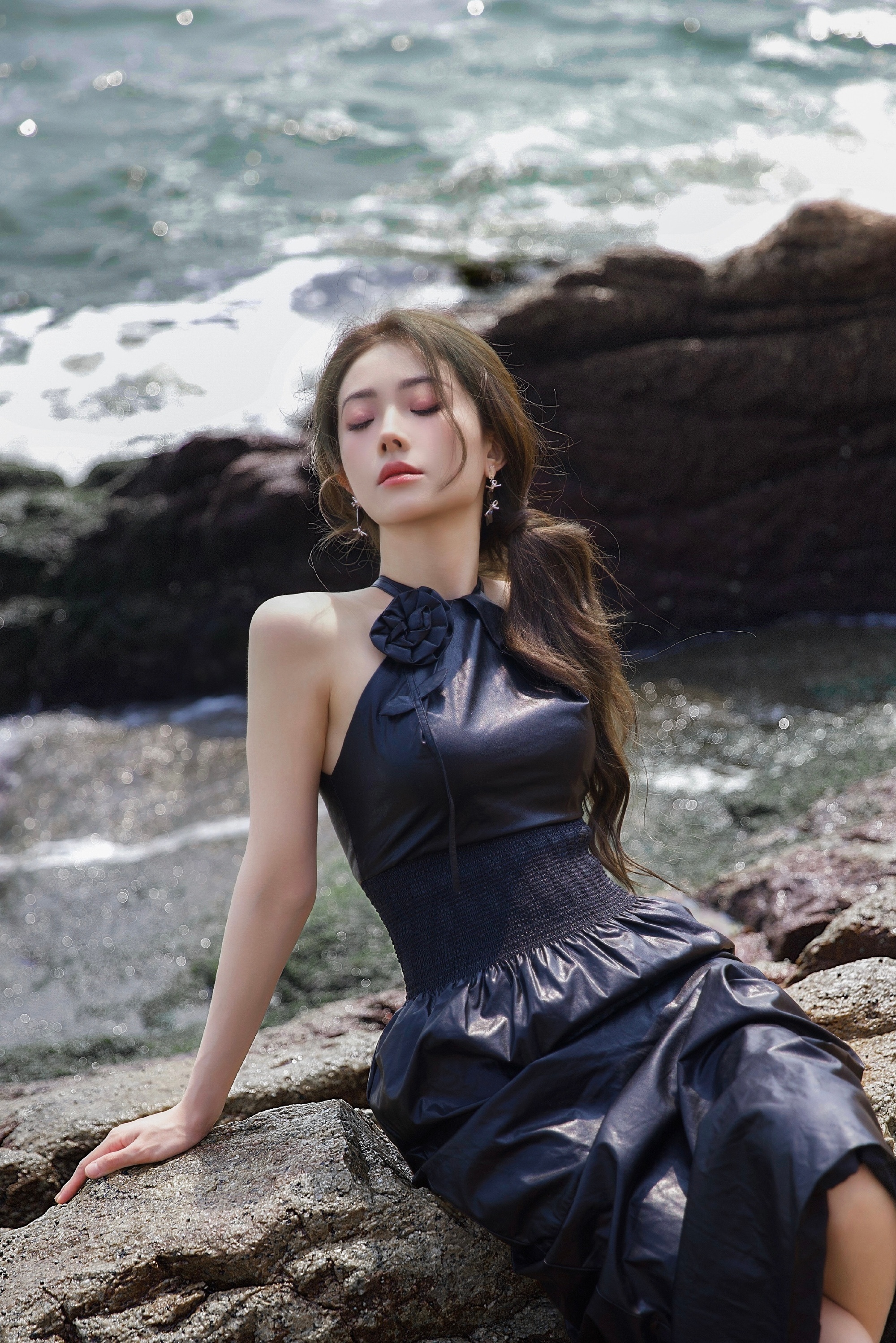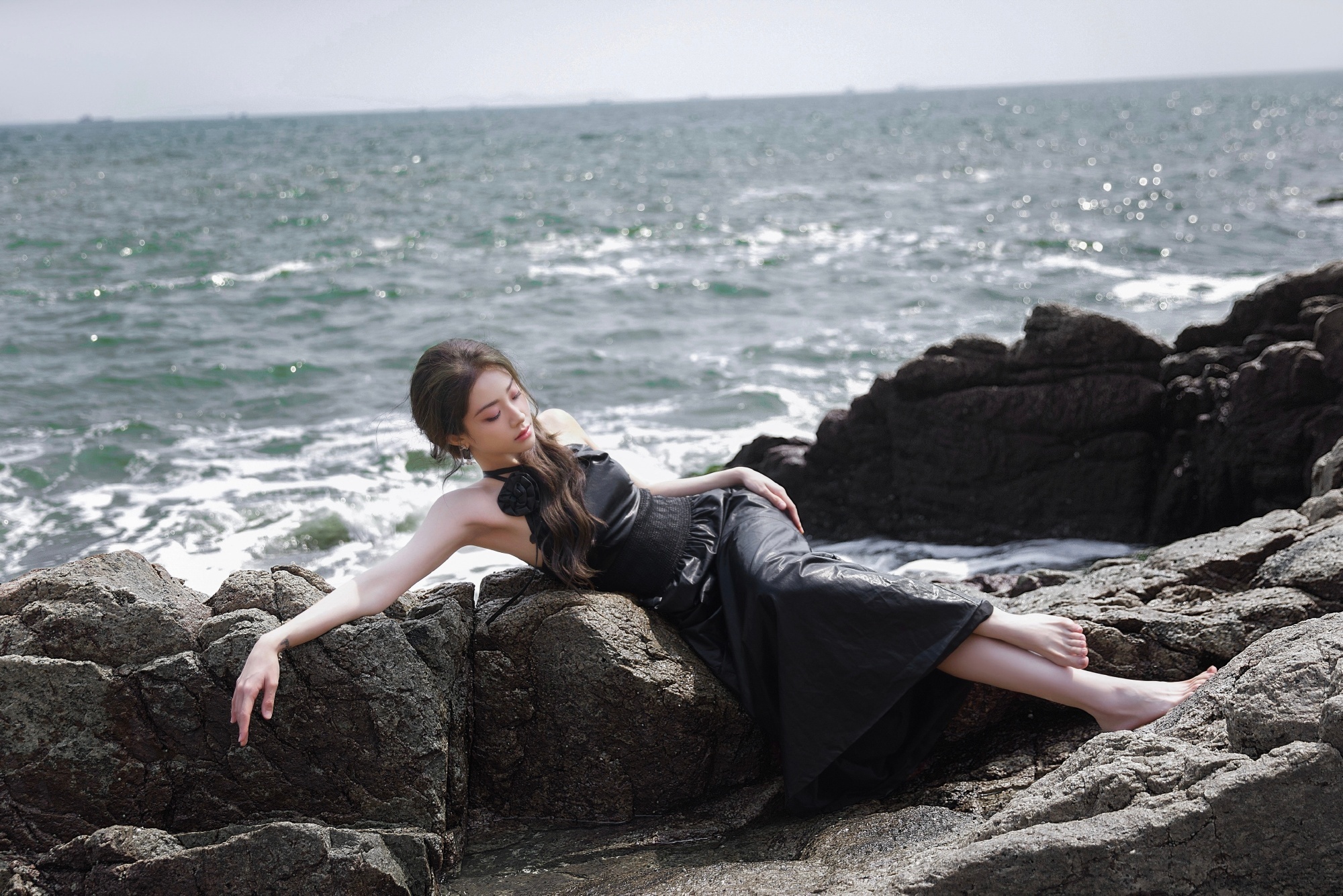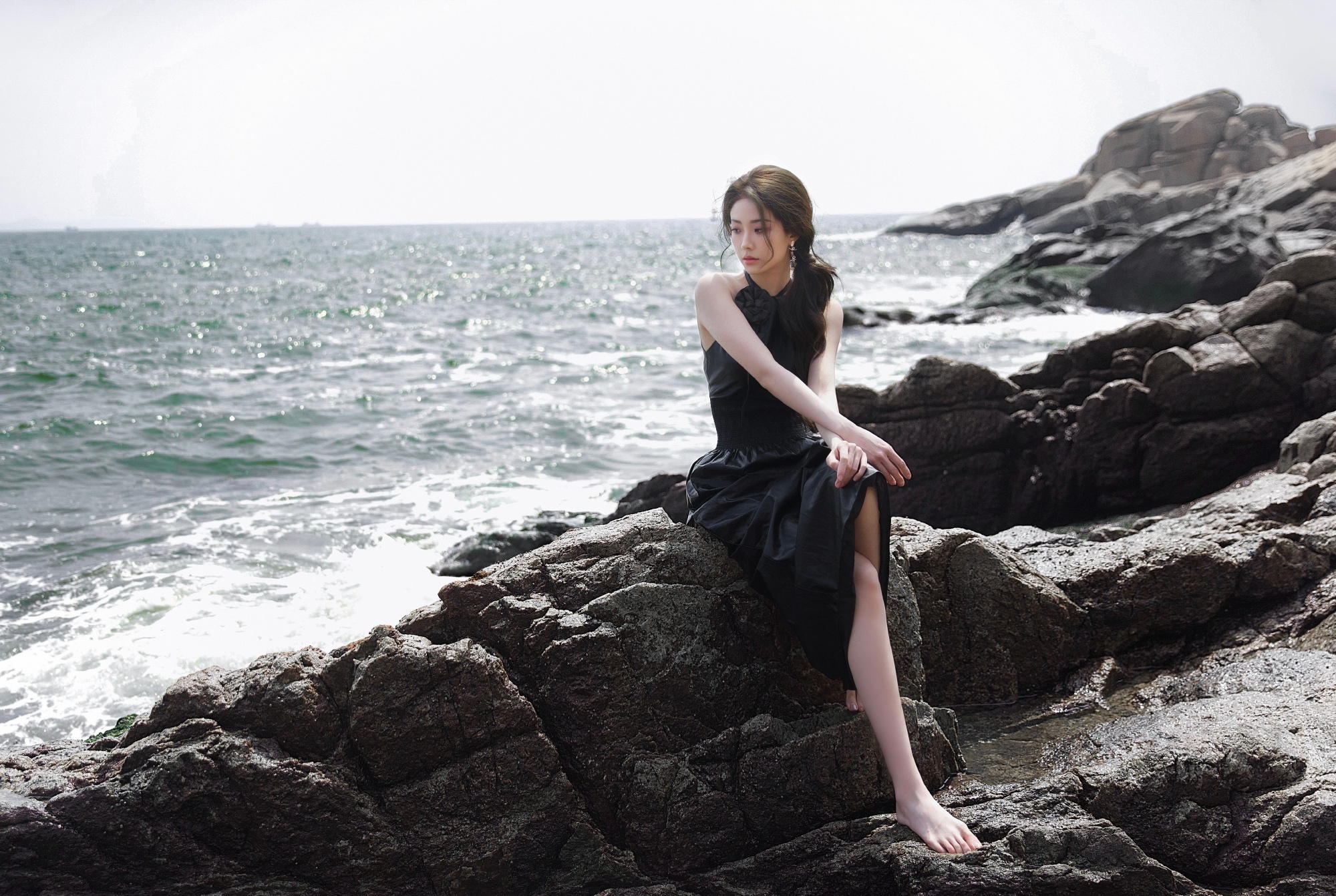 喻言海边美拍:黑裙子光脚丫,柔美感满满。喻言