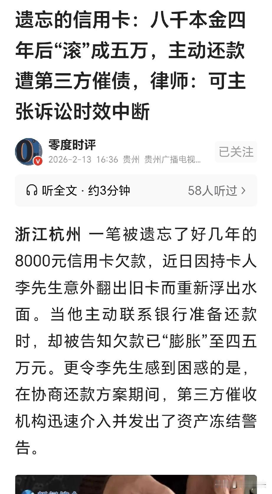 浙江杭州 一男子办了张信用卡,额度8000,男子很快花完,之后因为工作变动,卡不见了,男子就此遗忘,一直到几年之后,偶尔翻出了这张卡片,男子以为,欠了几年最多还一万多元,万万没有想到,他找银行主动还款,银行要他还四五万元,男子急了,和银行协商还款金额,谁知这时便开始收到第三方催收通知,对方要他尽快还款,不还就冻结财产,男子就奇怪了,为啥逾期几年,就没任何人提现他还款? 李先生最近烦恼不止,他若干年前在银行办了信用卡后,用完8000元额度后被他忘了,结果几年之后,等他想起来要还款,银行却告诉他说,他如今欠款已经将近50000元了。 李先生大吃一惊,他当初办卡时额度是8000元,怎么就能欠了这么多钱? 事情的起因是在2018年,当时的李先生在杭州一家工厂打工。 那时候他收入不多,为了方便消费,他在银行办了一张信用卡,信用额度有8000元。 这8000元对他来说,解决了他的生活大部分的问题,他用来购物,支付一些小额的生活开销,日子过得非常方便。 可没过多久,额度就用完,这时他的工作有了变动,他离开工厂,到了别处。 之后乱糟糟一阵子调整,生活节奏也忙碌起来,就在这忙乱之中,那张信用卡不小心丢了。 李先生找来找去找不见了,时间一长他竟然给忘了。 当时李先生满心投入到了新工作之中,他上班下班匆匆忙忙,根本没顾得上再找一找这张信用卡,他更是忘了卡里还有没还清的欠款。 时间一长,这笔欠款被他完全抛在脑后,仿佛从来不存在一样。 日子就这么一天天过去,直到最近,李先生整理旧物,偶然翻出了那张信用卡。 他盯着信用卡想了半天,突然想起来里面还有没还清的8000元欠款。 他一拍脑袋,埋怨自己咋就忘的一干二净,这么多年过去,这8000元带上利息,肯定早就翻到一万多元。 如果真的是如李先生所想,就是连本带息欠了一万多,那他就打算立刻还款。 可万万没有想到,他主动给银行电话询问还款的事情,却被工作人员告之,他已经欠了近50000元。 李先生惊呆,他完全没想到能滚到这么多,这数字巨大,对他来说着实有点困难。 李先生掂量了自己的实力,他实在一下子拿不出这么多钱,于是便向银行提出,他希望能缓一两个月让他有时间筹款。 银行答应给他减免掉一部分费用,可是尽管如此,他要还的金额依旧高达四五万元。 可筹集资金需要时间,银行会不会宽限,还在协商当中。 李先生忐忑不安,正在琢磨要如何筹钱,就在他等待银行协商结果的时候,麻烦事接踵而来。 短短数日,他的手机就开始闲不住了,他不停地收到第三方的催收电话和短信。 催收人员态度强硬,要他尽快还款,否则将冻结财产! 李先生急了,如果自己没发现那张卡,那也想不起来自己还欠了这笔钱。 奇怪的是,自己欠了这么长时间,逾期数年,可在这期间,他从未接到过任何来自银行或者催收几构的通知电话或者短信。 如果早点有人提醒他还有这笔债务,他也不至于会彻底忘记,当然更不会让这笔债务像滚雪球一样越积越多,一直积累到了四五万元! 面对这笔巨额压力,李先生真是不知道该怎么办才好了。 那么,这件事在法律上是怎么认定的呢?李先生该不该还这么多钱?时间过去已经那么久的时间,银行没催没提醒,到底是还还是不还? 《银行卡业务管理办法》第47条规定,信用卡透支利息按日利率万分之五计收,按月计收复利。 李先生8000元本金逾期数年,按日息万分之五计算,年化利率约18.25%,这部分是银行的合法收益,李先生有义务偿还。 但需注意,2024年施行的民法典规定,逾期利率不得超过年利率24%,超出部分无效。 银行计算的近5万元欠款中,若包含超出24%年化利率的费用,李先生可拒绝支付。 《民法典》第188条规定,信用卡逾期的诉讼时效为3年,自逾期之日起计算。 这就是说,银行需在李先生逾期后的3年内通过有效方式主张债权,否则李先生有权提出诉讼时效抗辩,拒绝偿还已过时效的债务。 即使需偿还债务,李先生也可依据《银行卡规定》第2条,要求银行说明利息、复利等费用的计算依据。 若银行在办卡时未对高额罚息条款进行明确提示,李先生可主张该条款无效,仅偿还本金及年化利率不超过24%的合理利息。 此外,第三方催收机构“冻结财产”的说法无法律依据,只有经法院判决后才能强制执行。 建议李先生先要求银行提供完整催收记录和费用明细,若协商不成,可向银保监会投诉或向法院起诉,通过法律途径维护自身权益。 对此,你怎么看?