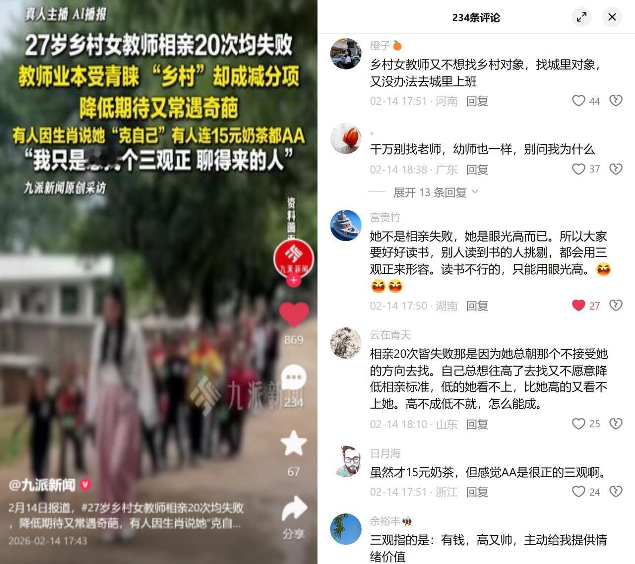 27岁硕士村小老师,相亲20次全黄! 王云是乡村特岗教师,硕士学历,相亲20次没成。要么遇着嫌她生肖克夫的奇葩,要么连15块奶茶都要AA的抠门男,她只说想找个三观合的人。 可大家全骂她眼高手低,把三观正直接等同于要车要房,这锅她背得冤死了! 别光站着说话不腰疼,她哪是不想进城找对象?特岗教师有3年服务期,定县定校定岗,跨区调动难如登天,违约还要赔违约金留信用污点,她是被规定死死锁在乡村了! 婚恋市场更是双标到离谱!明明教师职业在相亲市场吃香,可一沾乡村俩字,直接就成了减分项,合着乡村老师就得找乡村人?凭啥啊? 还有那些说AA是三观正的,15块钱AA本身没错,但搁第一次相亲的场合,这就是抠门!连杯奶茶的诚意都没有? 这一连串的相亲失败,背后是高学历基层人才的三重无奈:被规定锁死、被市场歧视、被外界误解!换作是你,读了硕士被困在乡村,想找个懂你的人,就这么难吗?
