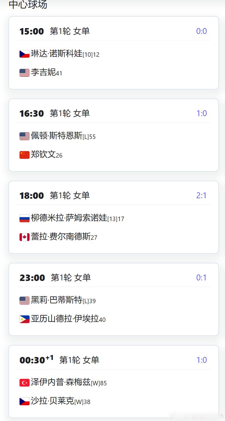 郑钦文在中心球场第2场出站,对手资格赛球员斯特恩斯,两人唯一交手记录去年在迪拜赛,郑钦文在那场比赛输给对手。