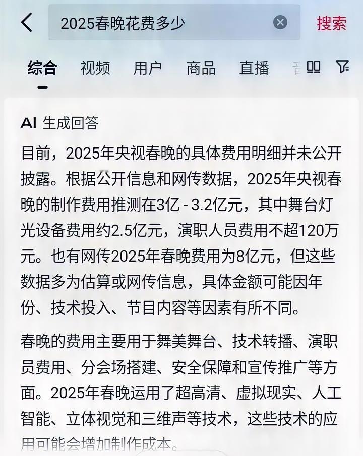 去年春晚有人说花了3个亿,有人说花了8个亿,具体花多少咱也不知道。 如果说把这笔钱省下来,是不是也能做好多事?
