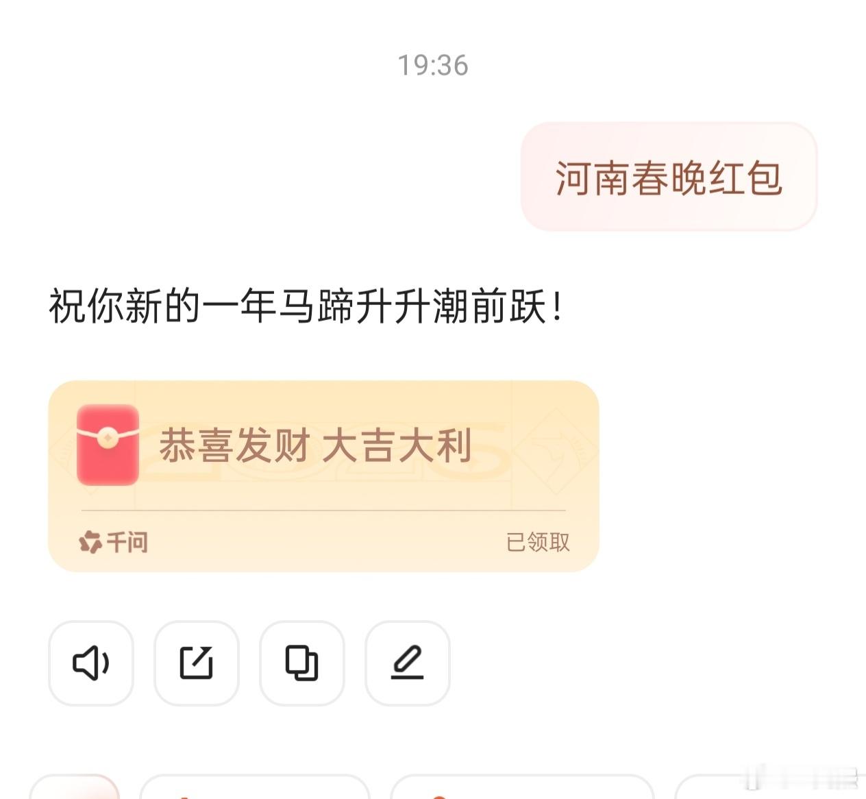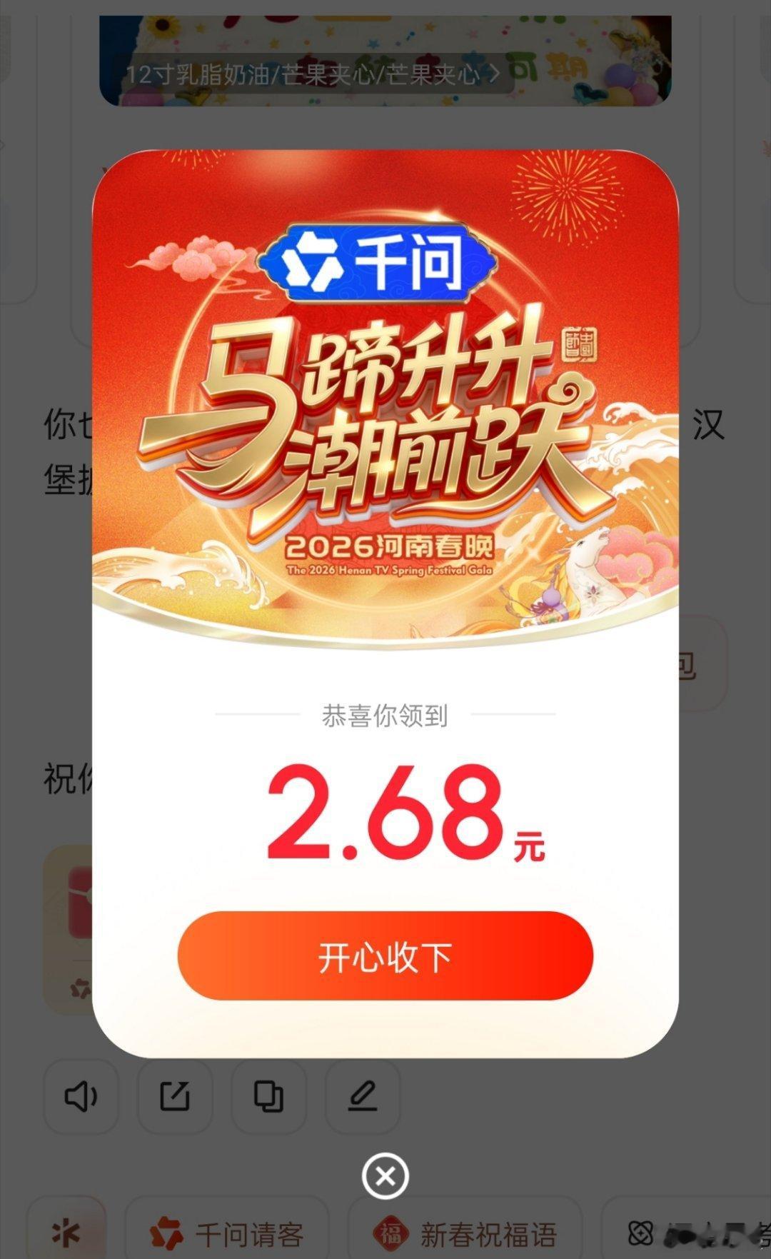 向千问发:河南春晚红包,可以触发隐藏口令,我领了2.68,大家快冲红包