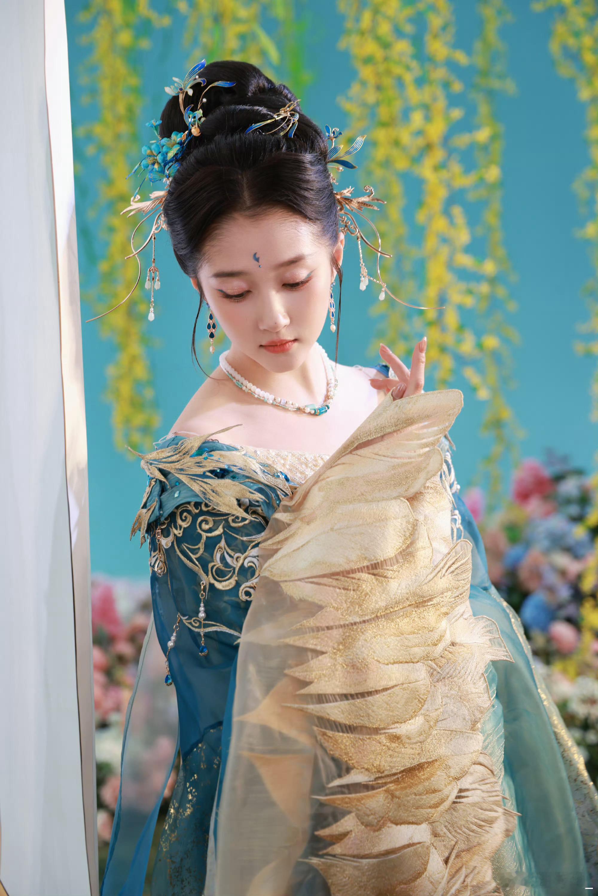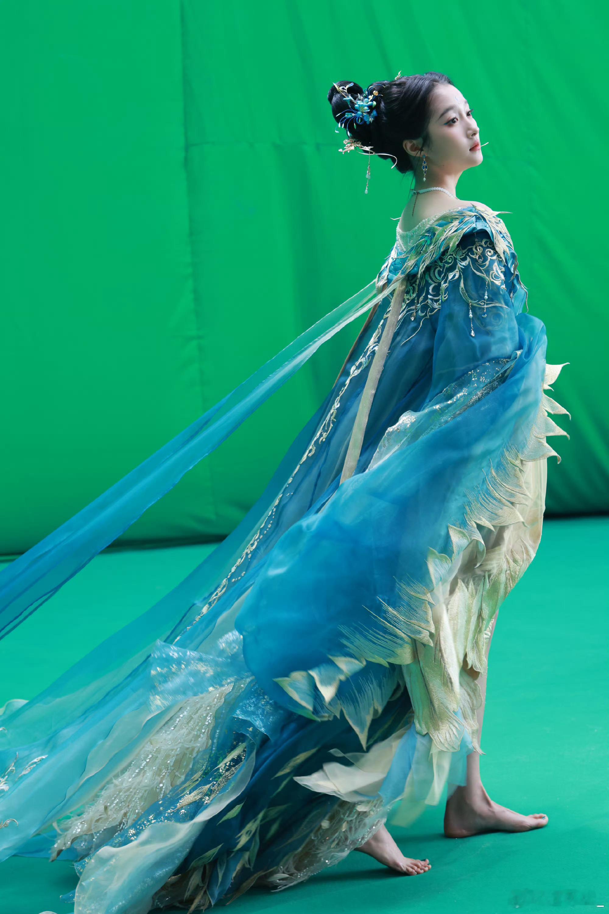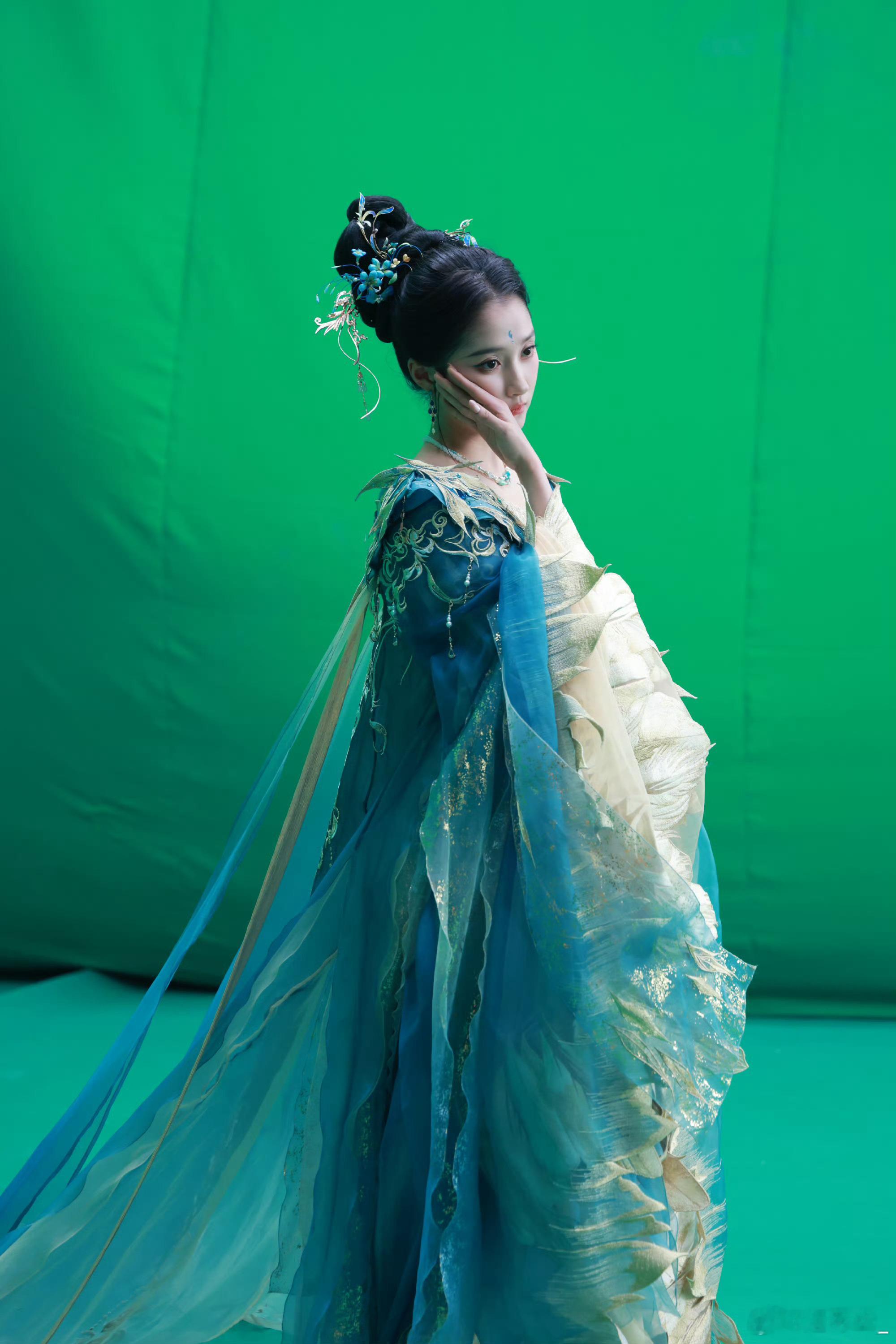 关晓彤青绿国风扮相 关晓彤这套青绿国风造型真的太绝了,精致的纹样配上飘逸的裙摆,低头的瞬间温柔又贵气,完全就是从画卷里走出来的佳人。