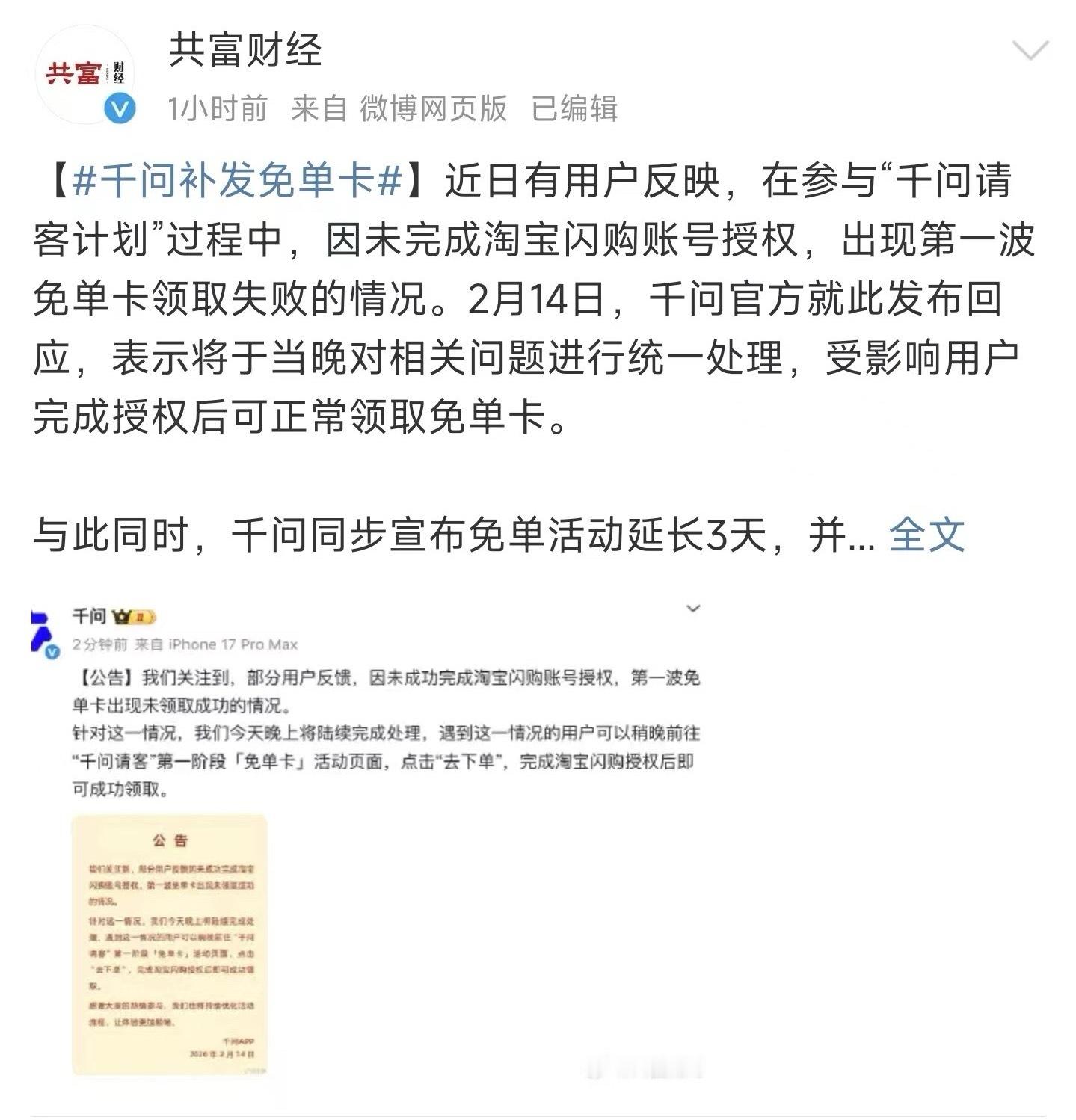 千问补发免单卡 这几天好多朋友在参与“千问请客计划”时,因为淘宝闪购授权这一步没操作好,导致第一波免单卡出现未领取成功现象,心里肯定挺着急。