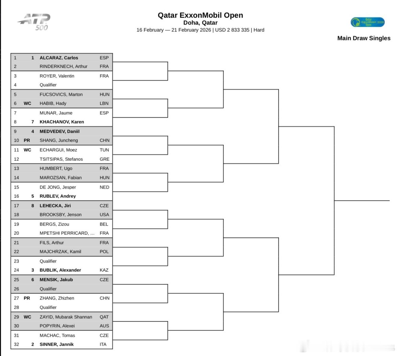 ATP500多哈公开赛签表出炉