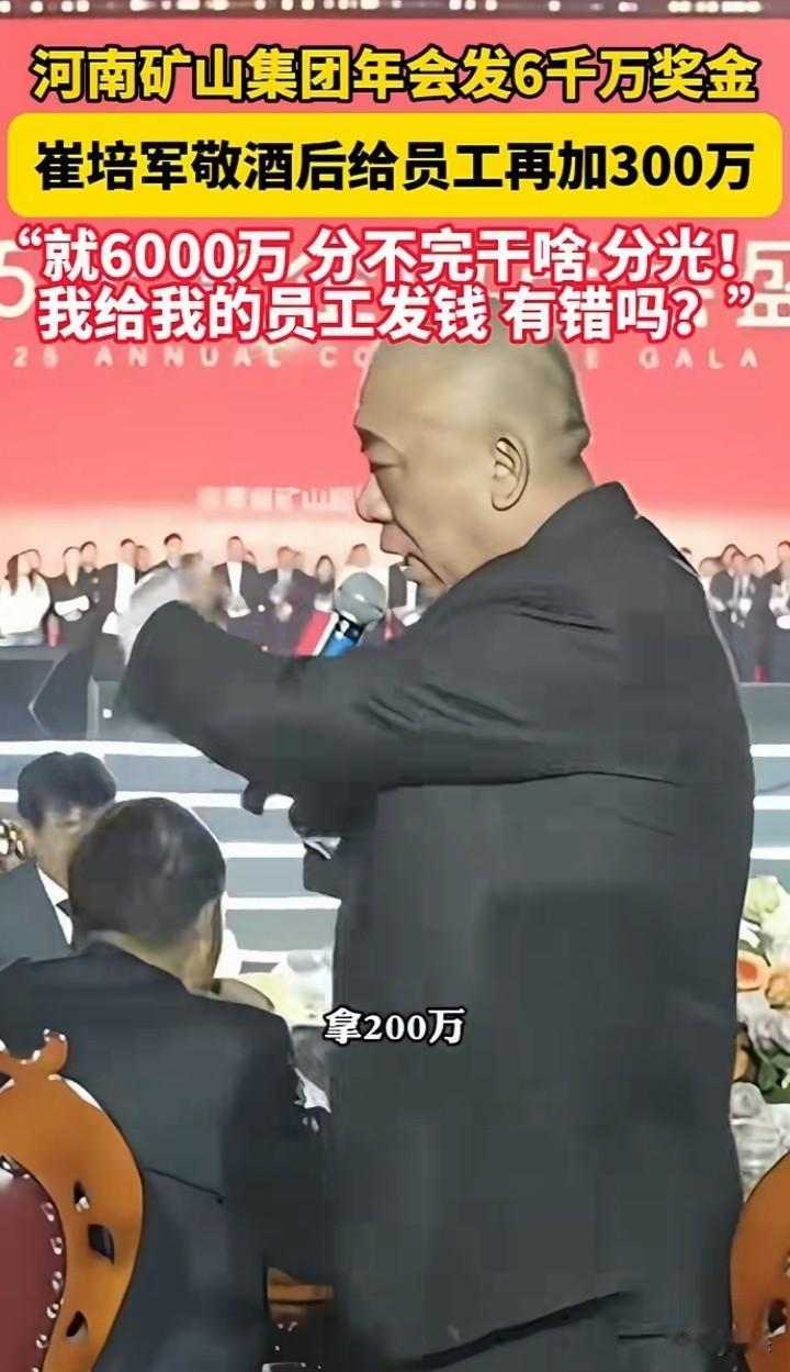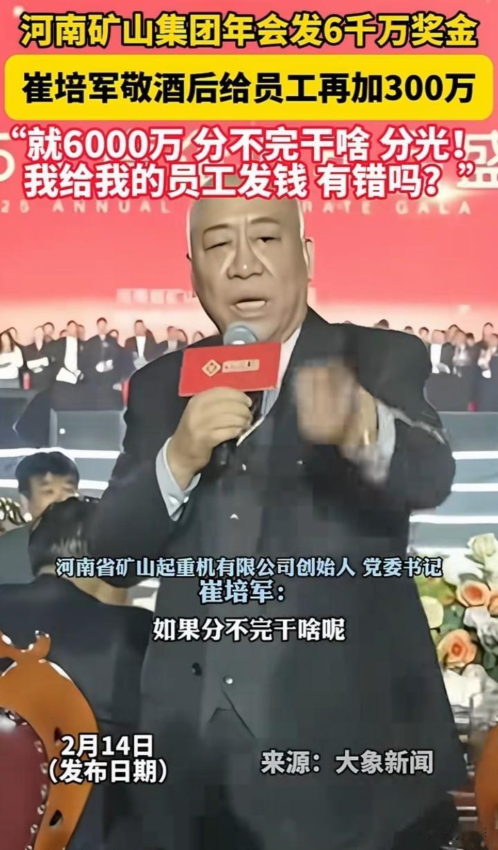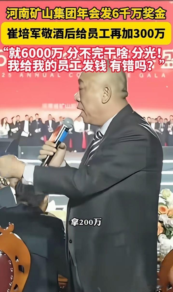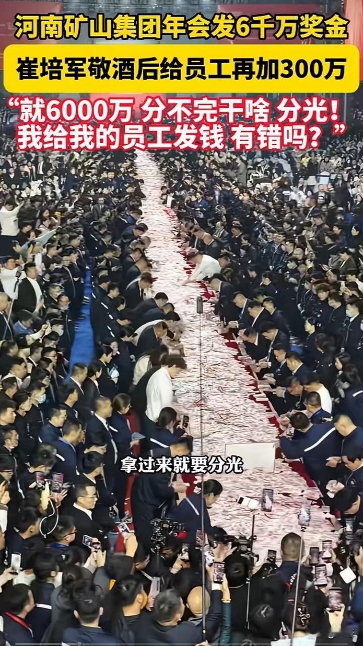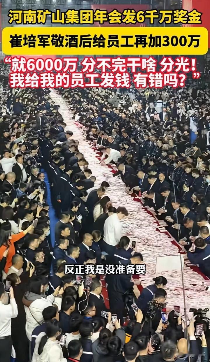 河南矿山集团年会发给员工6000万奖金,看着奖金摆满,数多少要多少,直到全部分完。 说实话这样老板员工都喜欢。用赚来的钱用作奖金,这样的老板我也喜欢。 你们你们年终奖有多少呢?