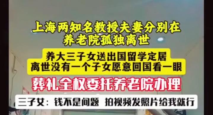 看了这个,不得不让人感叹,在头发看到这么一则头条新闻,据说上海有二位知名教授,分别在养老院内孤独终老,而最让人不能理解的是,这二位教授是膝下有三个儿女出国在外的,而这三个儿女面好父母亲的双双离去,竟然是全权养老院料理他们父母亲后事的。 按理说,生长在高知识分子家庭的子女,应该是不缺教育,不缺教养的。 但面对父母离世,全权让养老院代处理,是不是有不孝的感觉呢? 看来丁克族想丁克,也是对的!