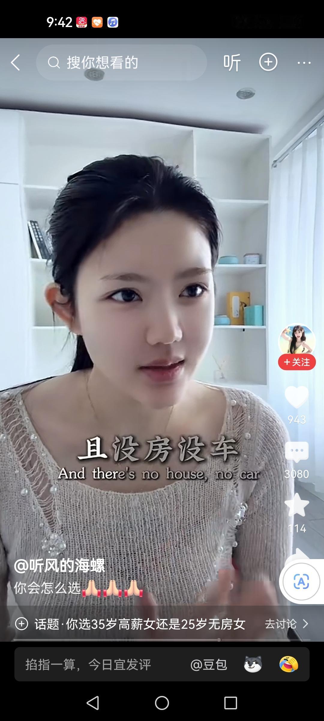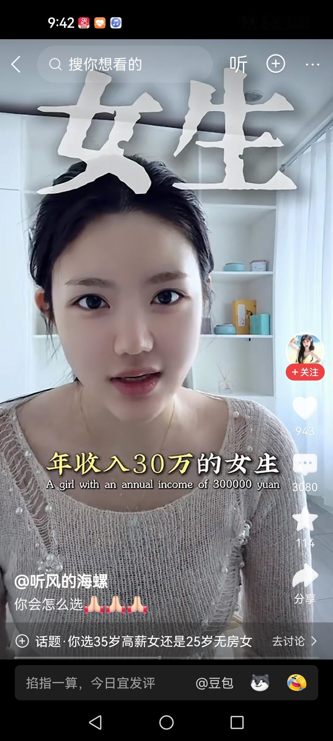 一位年轻漂亮女生发出的灵魂拷问!她想替所有的女生问一下天底下所有的男生:“在一个35岁有房有车有存款的年收入30万的女生和25岁的年薪3000且没房没车没存款的女生之间,你们到底会选谁呢?” 作为一名40多岁的中年男性,对这个话题想必是最有发言权了,相信绝大多数男性都会毫不犹豫的选择后者。 当然了,也有一些想躺平的男生会选择前者,但是对于前者来说,肯定不会选择那些想躺平的男生。 但是对于能够配得上有房有车年入30万女生的男性来说,他绝对会选择25岁的女生。所以这个问题是无解的。