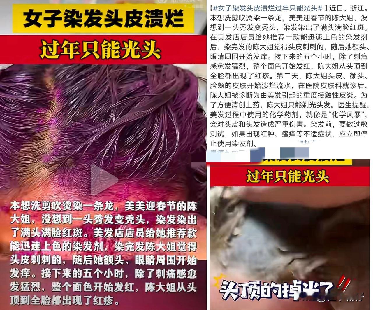 浙江杭州60岁的陈阿姨在春节前染发时,被店员推荐使用一款“快速上色染发剂”遮盖白发。染发后她立即感到头皮刺痛,随后额头、眼部发痒,5小时内面部出现密集红疹,次日头皮及面部皮肤开始溃烂流水。经医院诊断,为重度接触性皮炎,最终不得不剃光头发以便治疗。 类似案例在上海也有发生,一名女子在漂发后出现头皮化脓溃烂、大片脱发,被确诊为三度化学灼伤。以上事件均属于典型的染发剂过敏反应。 作为一名曾经经常染发的过来人,我想说,频繁染发、烫发确实容易损伤头皮、导致脱发。如果刚出现不适时就立即停止染发,或许可以避免后续严重后果。为降低染发带来的健康风险,建议注意以下几点: 1. 必须做过敏测试:即便是常用品牌,每次更换新品牌或新配方,都应在染发前48小时,在耳后或手肘内侧进行皮肤测试,确认无过敏反应后再使用。 2. 出现刺痛立即停用:染发过程中,只要感到头皮刺痛或灼热,应立即要求洗掉染发剂,切勿为了上色效果而忍耐。 3. 合理控制染发频率:建议每年染发不超过2到3次,如需同时染发和烫发,两者最好间隔两周以上,以减轻对头皮和发质的刺激。 希望这些提醒能帮助大家在追求美观的同时,更好地保护自己的健康。