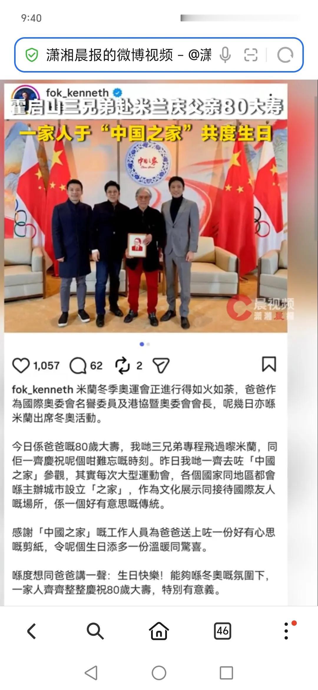 最羡慕的不是人家有钱,而是这浓得化不开的血脉亲情。 霍震霆80岁大寿,霍震霆的三个大儿子霍启刚、霍启山、霍启仁分别放下手头的工作,无论多忙,齐刷刷扑奔米兰,守在正在米兰忙活冬奥会的霍震霆身边,给老爹祝寿!霍震霆心里要多温暖有多温暖。 你看别的富豪,兄弟之间即使不反目,同框的也少。霍家三兄弟经常一起出席活动,总是保持家族步调一致,整齐划一,这是多好的感情,多高的素质。 霍震霆80岁了,穿着黑上衣,大红的裤子,一头银发,显示出与众不同豪门气质。 家族兴旺,一家子又是社会责任担当,祝愿老爷子健康长寿,愿霍家越来越兴旺发达!