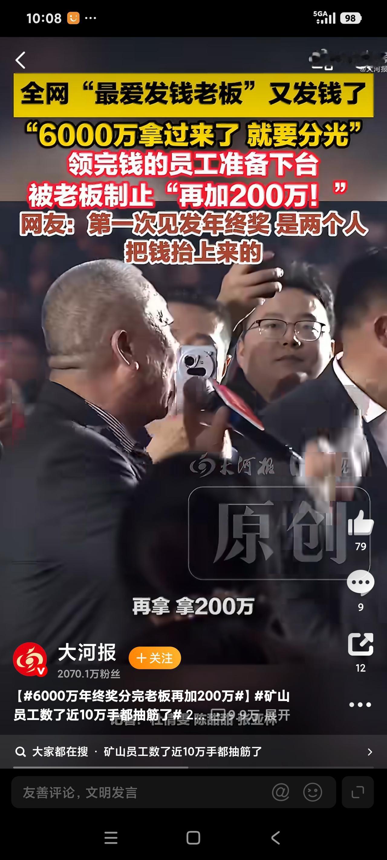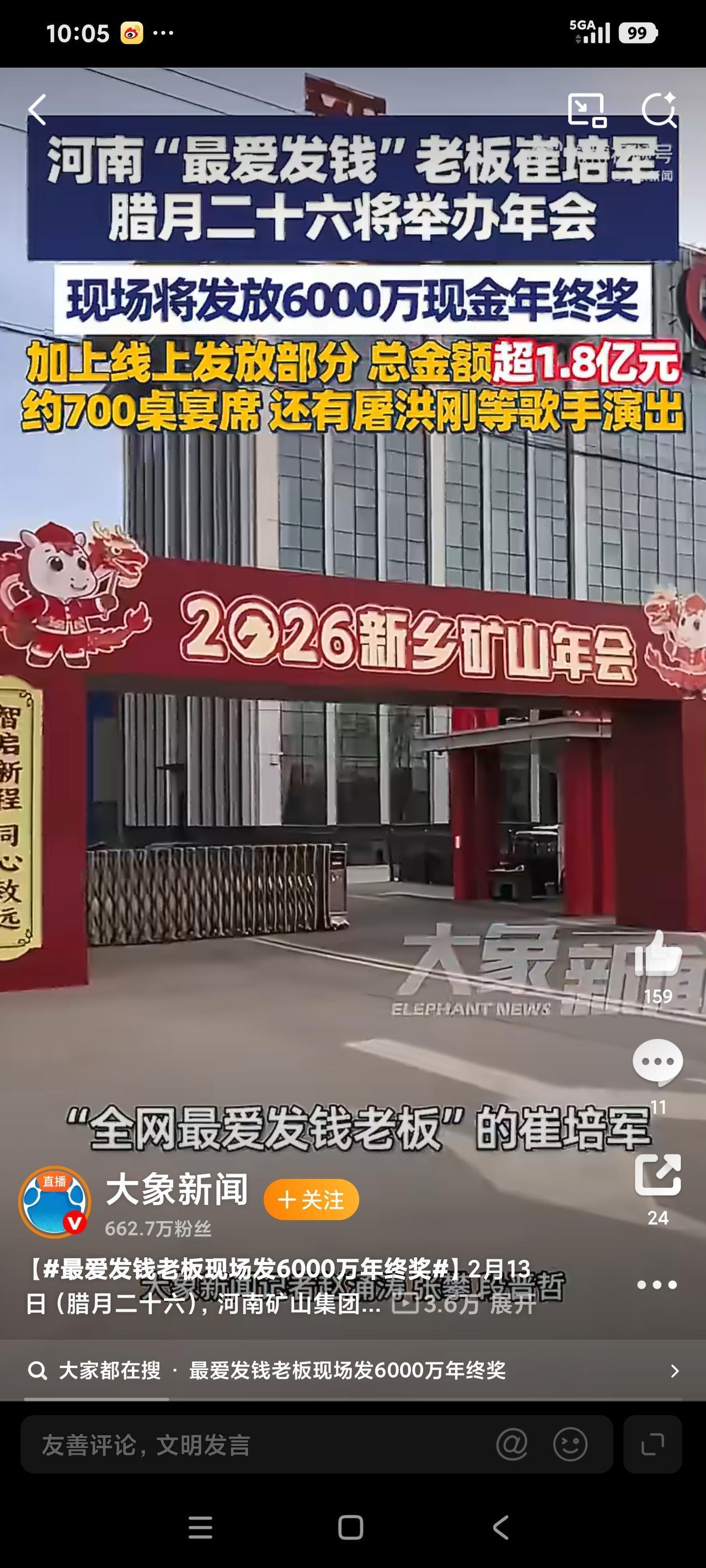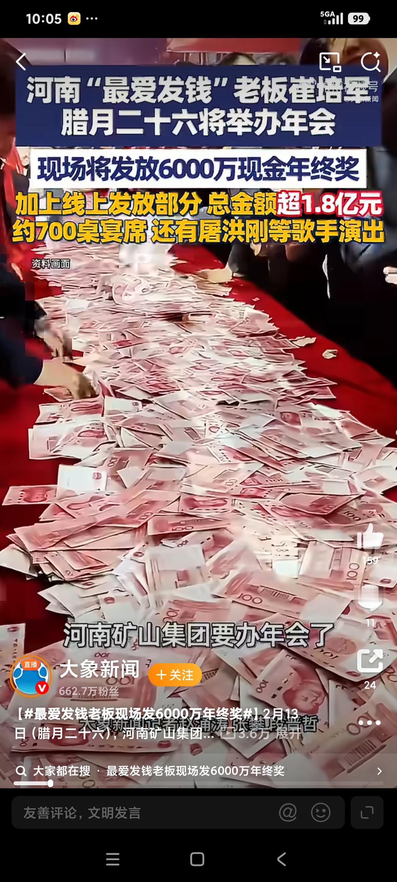 崔老板,还缺人吗? 这两天刷屏的是河南矿山公司。在该公司的年会上,崔老板大笔一挥,直接发放6000万现金。 看着一桌子的现金,看着喜笑颜开的员工数钱,不由得感慨,崔老板,还招人吗? 2025年河南矿山公司净利润2.7亿,而崔老板决定将60%,即1.8亿分给员工。如此的豪爽,真的是“绝世好领导”。 正如媒体报道的,矿山公司员工福利待遇本来就非常好。比如说,中秋节会给员工父母发放600元现金。妇女节会给女员工发放800元现金。 至于说,工资薪酬也是很丰厚的。而更为刺激员工努力工作的,就是将业绩与奖金直接挂钩。有员工因为业绩突出而获得高达500万的奖金。 到了一年一度的公司年会上,矿山公司崔老板更是“豪爽大气”,不吝惜金钱,追求“财散人聚”,以达到员工与企业多赢的效果。 特别是崔老板让员工“数钱领红包”策划,也是非常的高明。数钱领红包规则很简单,限定时间内,数准就可以领走。 不过,要是心太贪,数的多,但是数错了,那就错一张退十张。当然,数准了,那有多少领多少。据说绝大多数员工也就是十万八万,最多的领到过20万。 一个发红包也考验人性。正如崔老板说的,“希望员工多数一点。即讲究数量,也讲究质量。待会啥都别想,就想着数钱,多数点”。 话语简单朴实,但这样的认知与理念,足以让河南矿山公司成为员工心目中的最佳企业。 当然,我不是说崔老板如此个性,又充满创意的发红包形式,而是说该公司能够与员工分享60%的净利润,这足以让员工“热爱”。 其实,与河南矿山公司一样的,敢于与员工分享收益的企业还有很多。比如说,也是河南的于东来老板,就是如此。 按照媒体报道,今年胖东来的净利润大概15个亿,而据说于老板说了,要将95%与员工分享。如此以来,每个员工据说能够领到10万。 是否如此,没有看到或者见到胖东来的视频与报道,更没有看到胖东来员工个人晒年终奖,也就不得而知。 说实话,我并不赞成企业将净利润高比例分配出去,或许应该将净利润用于“扩大再生产”。也就是说,用于企业的发展,或许更为合理些。 现实中,如河南矿山公司或者胖东来公司都是我国最优秀的公司之一,相比“大厂”而言,这两个企业员工的“门槛”不会太高。 到此,我就想问一句,老板,还招人吗?当然了,我也知道,门槛不高的企业,诸如胖东来公司,其内部管理是非常严格的。 没有看到河南矿山公司员工的“声音”,但是胖东来的管理严格是时不时能够在网络上看到。这种内部管理的严格,甚至严厉,或许仁者见仁智者见智,但是,我以为管理出效益和效率,应该是必然的。 对我来说,既然寻求到这些拥有较高薪酬福利的企业,自然我就能遵守这些企业的“奇葩”管理要求。比如说胖东来的于老板规定,员工之间不能随礼,不靠父母买房买车等等。 此类规定明显有干涉员工“个人权利”的嫌疑,甚至根本不合理,但是,我要想追求高的福利待遇,自然会接受的。 毕竟,众所周知“大厂”的高福利待遇,可普通人的我没有资格与机会。就如马老板说过,996是福报。当时不理解,如今想来,能够进入“大厂”,拿到百万年薪,别说“996”了,就是“白加黑”,甚至“7+11”,都能接受。 在这里,我只是说我自己的感受。或许,不同人有不同的看法。可当我看到,今年网络上有“挣不到钱,回家不受老婆待见”的八卦时,真的是发自内心的询问,老板,还缺人吗?