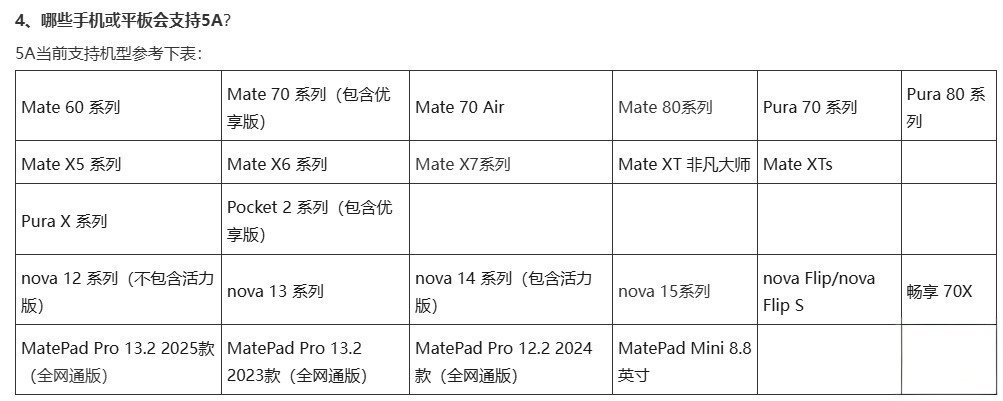 华为官网更新了 5A 相关问题的支持文档,公布了支持 5A 技术的详细机型清单,涵盖手机及平板产品线,包括畅享 70X 等一系列机型均有涉及。
