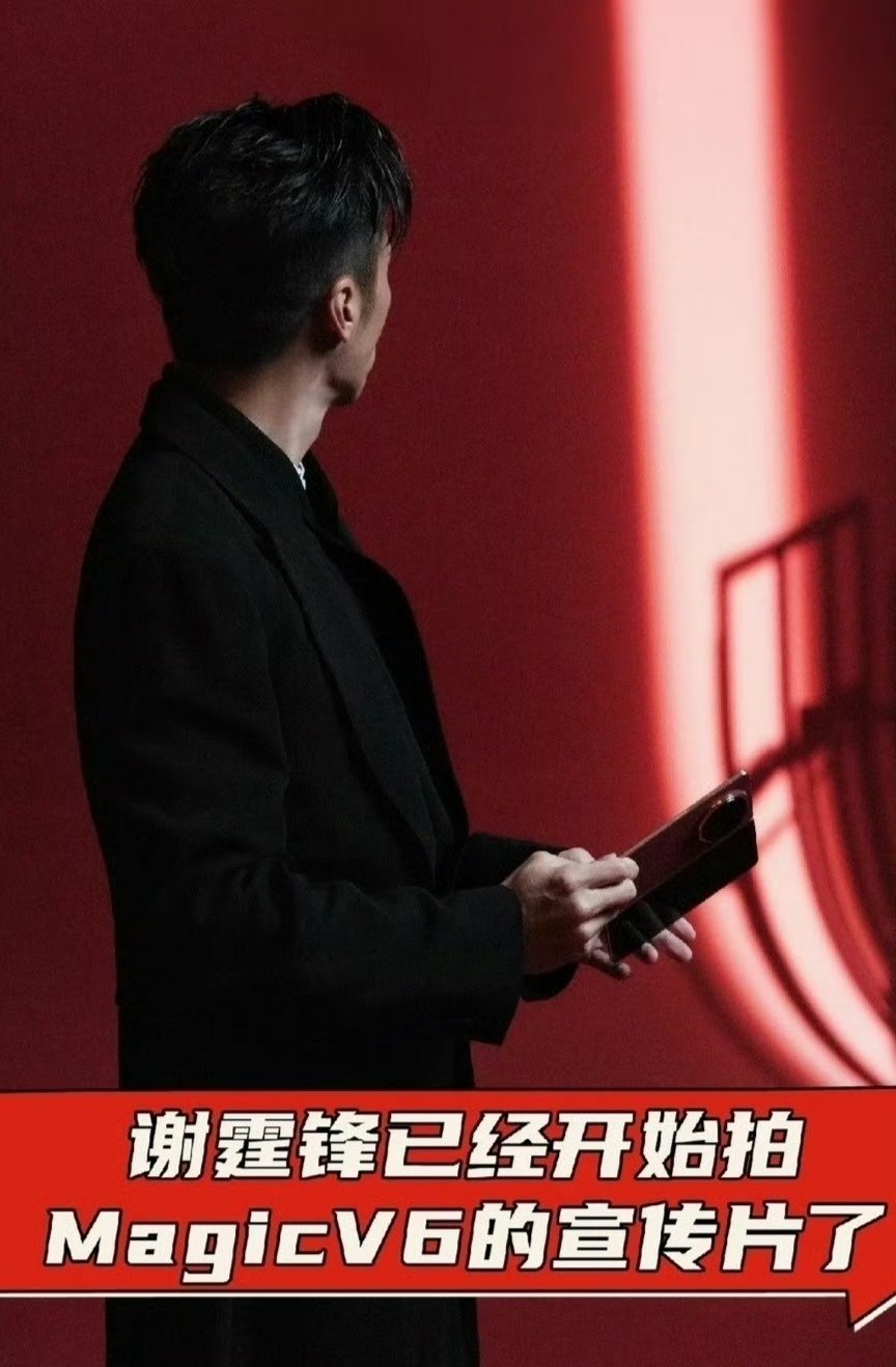 谢霆锋曾担任荣耀未来科技体验官,并亮相荣耀Magic8系列新品发布会现场,与荣耀CEO李健共同讲述“进化”的故事。结合以上信息,谢霆锋很可能是在为荣耀Magic V6拍摄宣传图片。