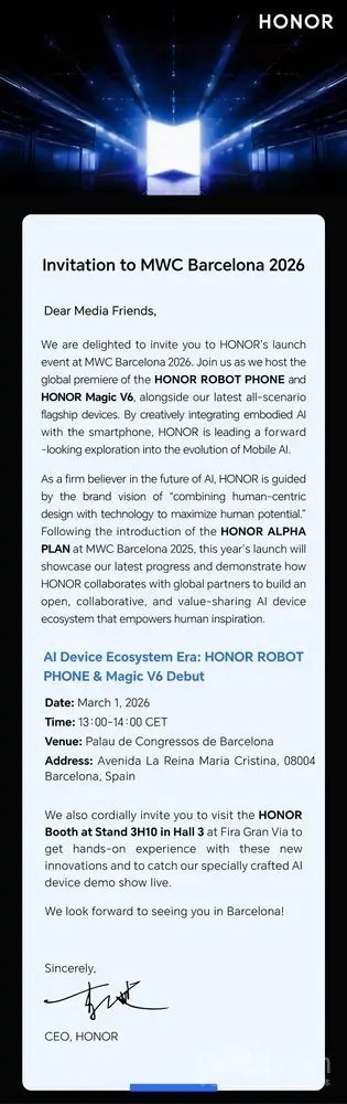 值得一提的是,2026年1月,荣耀正式向发出邀请函,宣布将于3月1日在巴塞罗那MWC2026展会上,推出两大重磅新品——荣耀Magic V6和荣耀ROBOT PHONE。