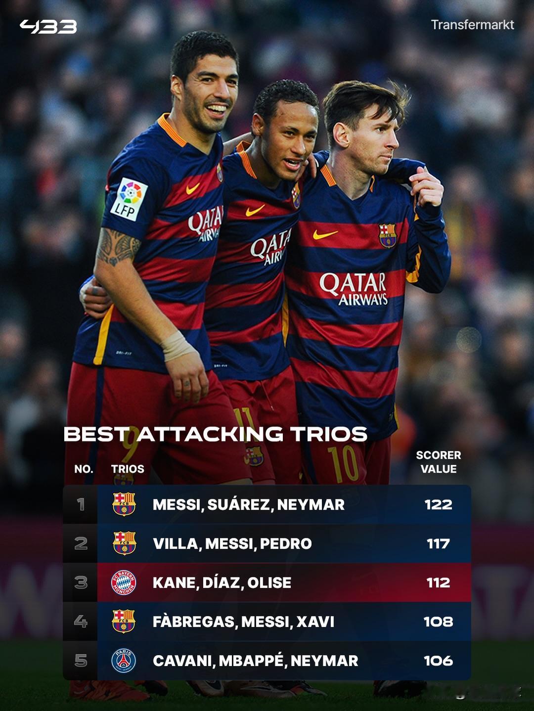提到国际足坛历史最强三叉戟组合,绝大多数人都会认为最强的是来自巴塞罗那的MSN组合。但如今,拜仁全新三叉戟正在逼近MSN神迹! 数据德国转会市场网站刚刚更新了一个恐怖的榜单!本赛季至今,拜仁的“KOD组合”凯恩+奥利塞+迪亚斯已经联手轰出了112个进球+助攻!这直接把当年皇马的BBC(101球)和巴黎的CNM(106球)全部甩在了身后。 现在摆在眼前的只剩两座大山:梅西+比利亚+佩德罗的117球,以及——MSN的122球! 15/16赛季无所不能的梅西、苏亚雷斯、内马尔组合,当时他们单季狂造122球,被视为足坛进攻组合的天花板。而现在,拜仁三叉戟距离这个神迹只差10球!而本赛季拜仁还有多场比赛要踢。 看看榜单前几名,几乎被巴萨梦三王朝霸榜,哈维、伊涅斯塔、法布雷加斯这些中场大师都在列。而今年,拜仁三侠正在用最残暴的方式,硬生生把自己的名字刻进了历史级进攻组合的行列! 凯恩的中锋支点+奥利塞的边路爆破+迪亚斯的灵活串联,这个组合化学反应太恐怖了。关键是,赛季还没结束! 大家觉得拜仁这三人能打破MSN的122球纪录吗?评论区见分晓!