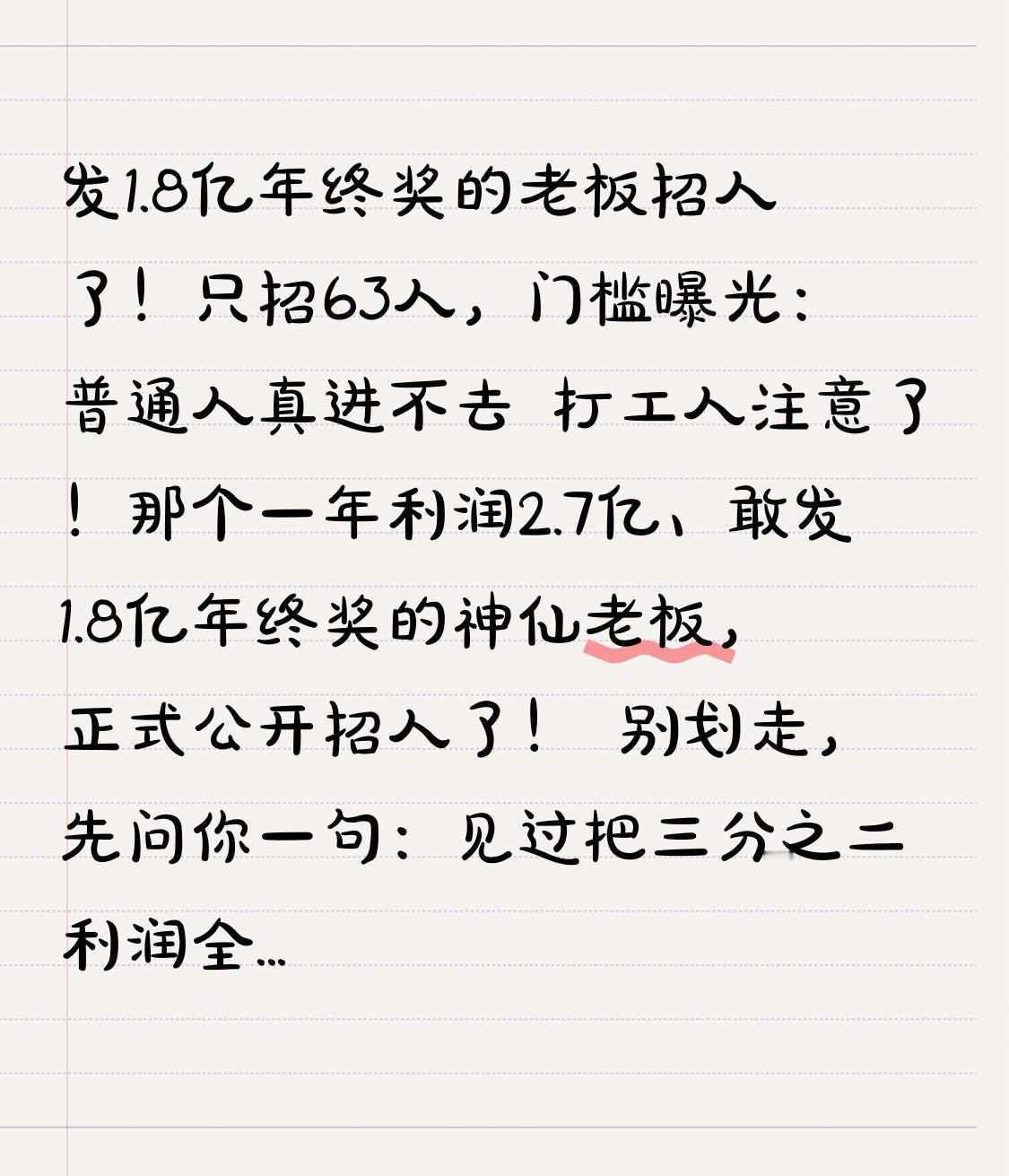 发1.8亿年终奖的老板招人了!只招63人,门槛曝光:普通人真进不去 打工人注意了!那个一年利润2.7亿、敢发1.8亿年终奖的神仙老板,正式公开招人了! 别划走,先问你一句:见过把三分之二利润全分给员工的老板吗?年会现场堆成山的现金,6000万直接现场发,员工数多少拿多少,还有宴席、演出、家属双倍红包,连续多年年终奖破亿。全网都在喊:这班我愿意上! 就在大家羡慕到破防时,重磅消息来了:河南矿山集团2026年扩招,只招63人。消息一出,几千人疯抢,简历挤爆邮箱,电话打到深夜。 但我必须泼一盆冷水:你以为有钱就能进?大错特错! 转折点来了:这家公司不是随便招人,而是严选精英。仿真分析岗要求211、985硕士起步,仅3个名额;工艺工程师、生产管理岗,必须5年以上大厂经验;核心技术岗,看重能力、忠诚、踏实。老板说得直白:报名太多,只能优中选优。 很多人吐槽:这么好的待遇,门槛还这么高? 真相扎心了:好福利从来不是天上掉馅饼。老板崔培军说,不是我爱发钱,是年轻人车贷房贷压力大,我能帮一点是一点。但他更明白:企业要长久,必须靠真本事的人。不搞佛系养人,只奖励奋斗者;不画大饼,用真金白银回报付出。 你看,人家员工流失率不到5%,核心岗留存超90%。不是靠运气,是靠老板舍得、员工拼命的双向奔赴。 这才是最该火的职场真相:靠谱的平台,从不亏待努力的人;大方的老板,只拥抱同频的战友。 别再抱怨工资低、老板抠、没机会。与其羡慕别人的1.8亿,不如问问自己:你的专业够硬吗?经验够足吗?态度够稳吗? 这个世界最公平的是:高福利永远匹配高价值。你能为公司创造多少,就能拿到多少回报。 2026年,别再躺平了。哪怕进不去这家神仙公司,也要把自己练成老板抢着要的人。 致所有打工人:愿你遇到大方的老板,干着有奔头的工作,拿着不委屈的收入,一年更比一年强!