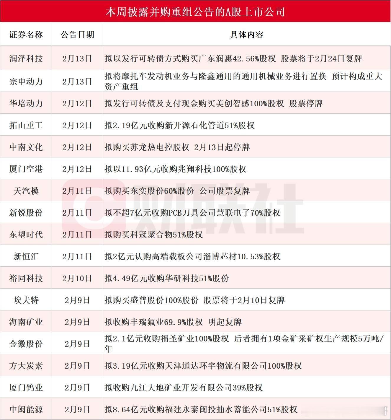 【近20家A股上市公司本周披露并购重组最新公告 润泽科技拟购买广东润惠42.56%股权 股票将于2月24日复牌】据不完全统计,截至发稿,本周(2月9日-2月14日)包括润泽科技、宗申动力、华培动力、拓山重工、中南文化、厦门空港、天汽模、新锐股份、东望时代、新恒汇、裕同科技、埃夫特、海南矿业、金徽股份、方大炭素、厦门钨业和中闽能源在内的17家A股上市公司披露并购重组进展最新公告。其中,润泽科技拟以发行可转债方式购买广东润惠42.56%股权,股票将于2月24日复牌。