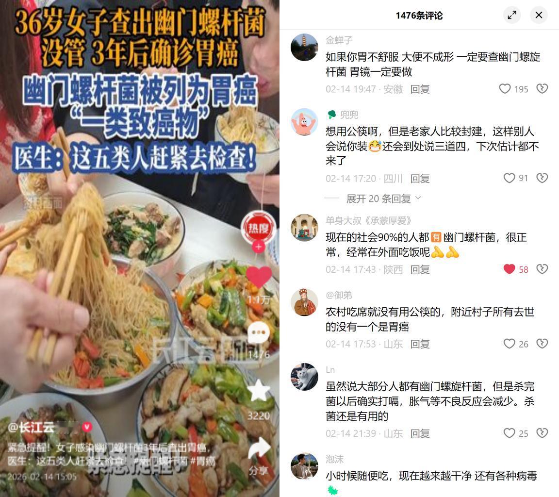 36岁女子拖成胃癌 36岁王女士查出幽门螺杆菌没当回事,三年后确诊胃癌。这事一出,网上吵得不可开交。 有人慌到立刻预约胃镜,有人甩一句90%的人都有,管它干嘛,还有人吐槽想用公筷却怕被亲戚说装,连聚餐都不敢提。 别瞎焦虑也别不当回事!按官方指南,真正的胃癌高危人群是这五类:幽门螺杆菌感染者、有胃癌家族史、有慢性胃病史、住胃癌高发区、有高盐/抽烟酗酒习惯。 幽门螺杆菌是一级致癌物,感染者胃癌风险高2-3倍,但规范根除(四联药10-14天),能让高危人群的胃癌风险降52%,有家族史的甚至能降73%。 别拿身边人没事当借口,幸存者偏差骗得了自己骗不了身体;也别让人情世故挡了健康路,该用公筷就提,该治疗就治,真等出事就晚了!