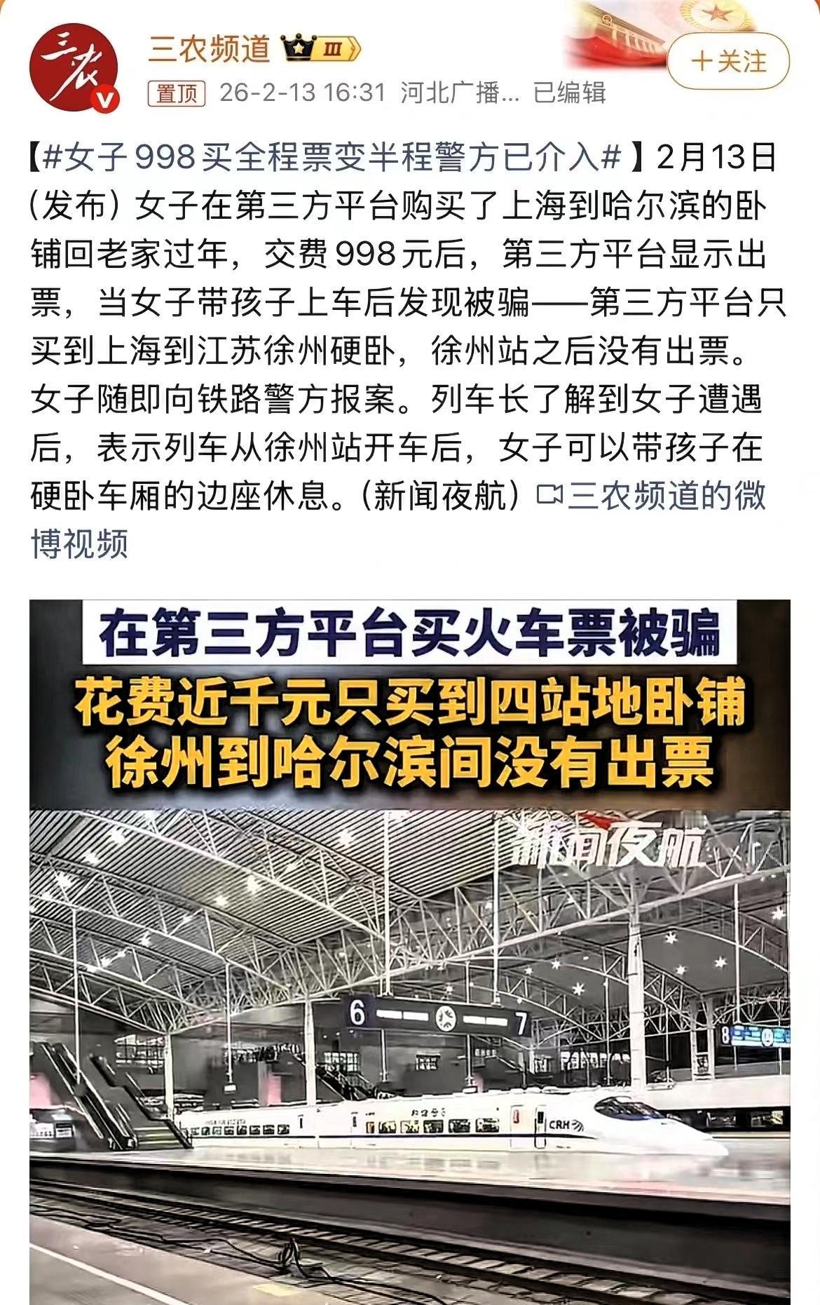 真的破防了。一位妈妈付了998块钱,带着孩子高高兴兴上火车回哈尔滨过年。可上车后经列车员核查,车票仅到徐州,后续路段并无有效车票。 事发突然,这位母亲一边安抚身边孩子,一边向乘警反映情况。列车方考虑到她们实际困难,安排其在徐州之后继续在车厢边座就坐,但徐州到哈尔滨仍有千里路程,旅途十分不便。 近年来,铁路部门早已明确,所有火车票均通过12306官方渠道统一发售,第三方平台并无独立票源。所谓抢票、加速包等服务,本质上多是依托12306候补功能,部分平台将免费服务包装成付费项目,误导消费者额外支出。 更值得警惕的是,个别平台在票源紧张时,不如实告知消费者购票情况,擅自购买短途票并虚假显示全程出票成功,将乘客顺利送上车,却把中途无票的风险留给旅客。这种行为不仅严重侵害消费者权益,也给春运出行秩序带来不良影响。 此前,多地监管部门已集中约谈票务平台,规范宣传与售票行为,严厉打击虚假出票、误导消费等问题。旅客在春运期间购票,应尽量选择12306官方渠道,信息透明、售后便捷,能最大程度避免类似遭遇。 出行安全与顺利,是春运期间每个人最朴素的愿望。平台理应承担社会责任,诚信经营,而不是利用旅客回家心切牟利。遇到不合理收费或虚假售票行为,消费者应及时保留证据,向监管部门和铁路方投诉维权,维护自身合法权益。 平安回家比什么都重要,多一分谨慎,就能少一分麻烦