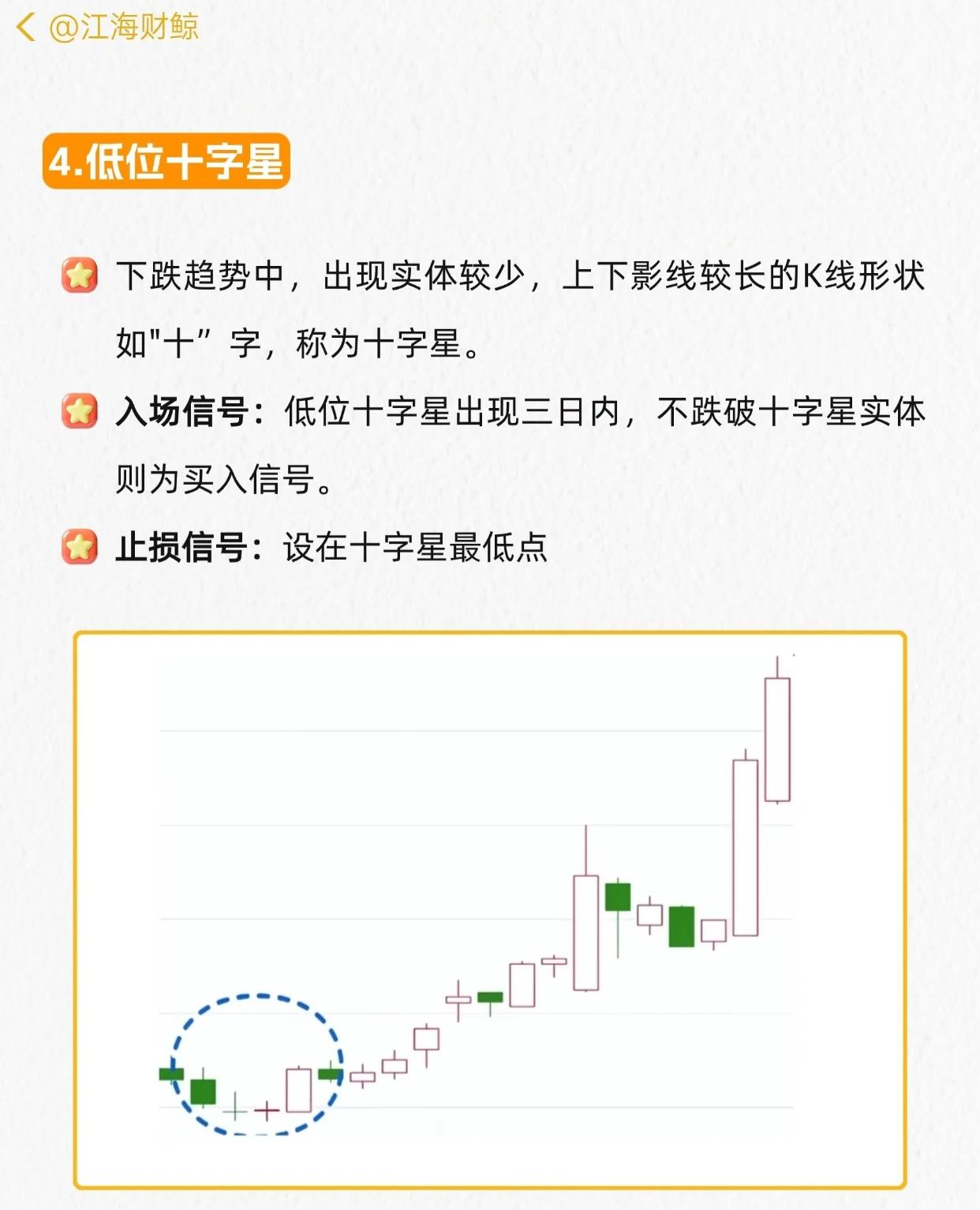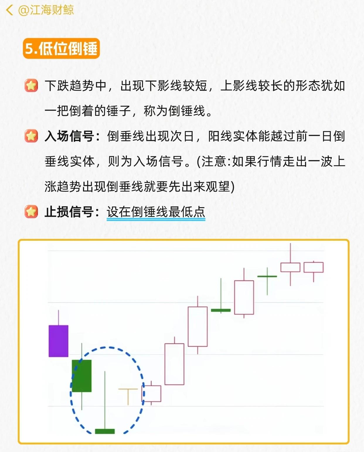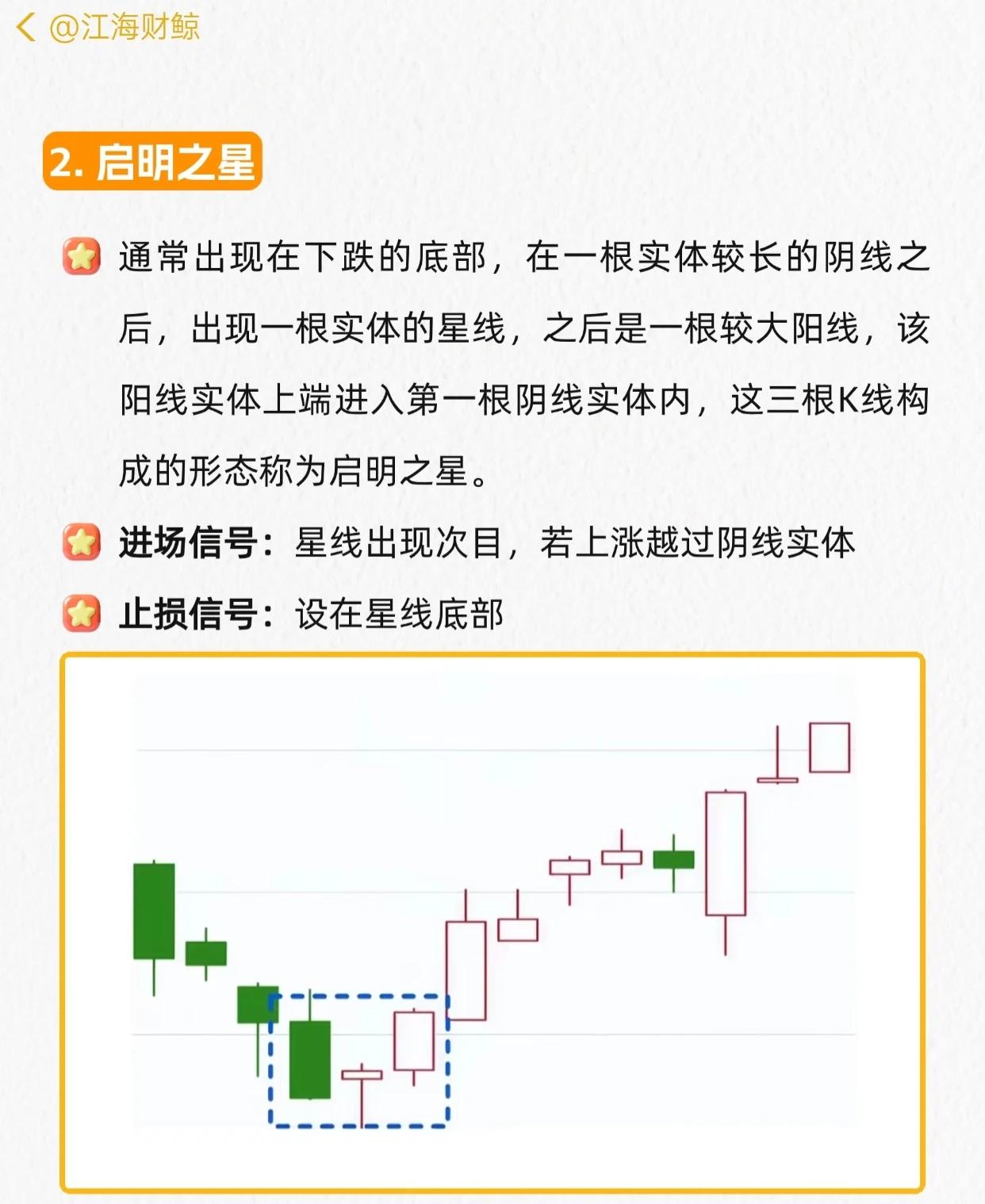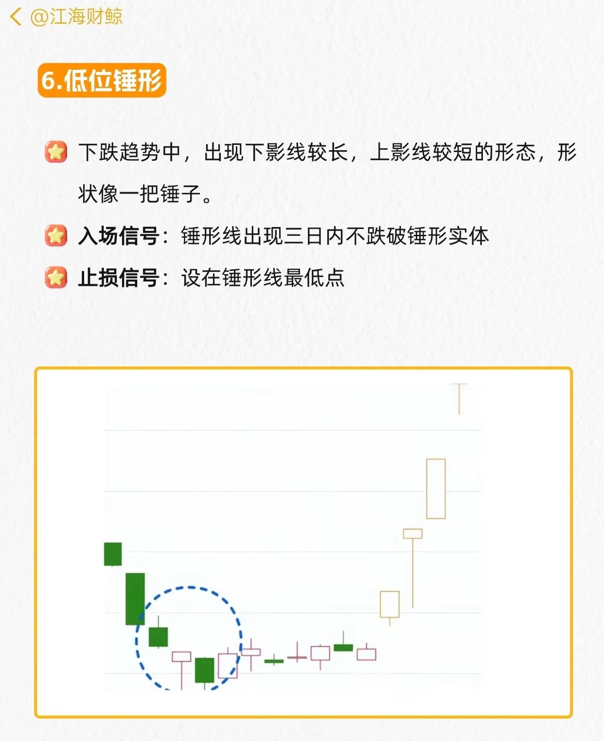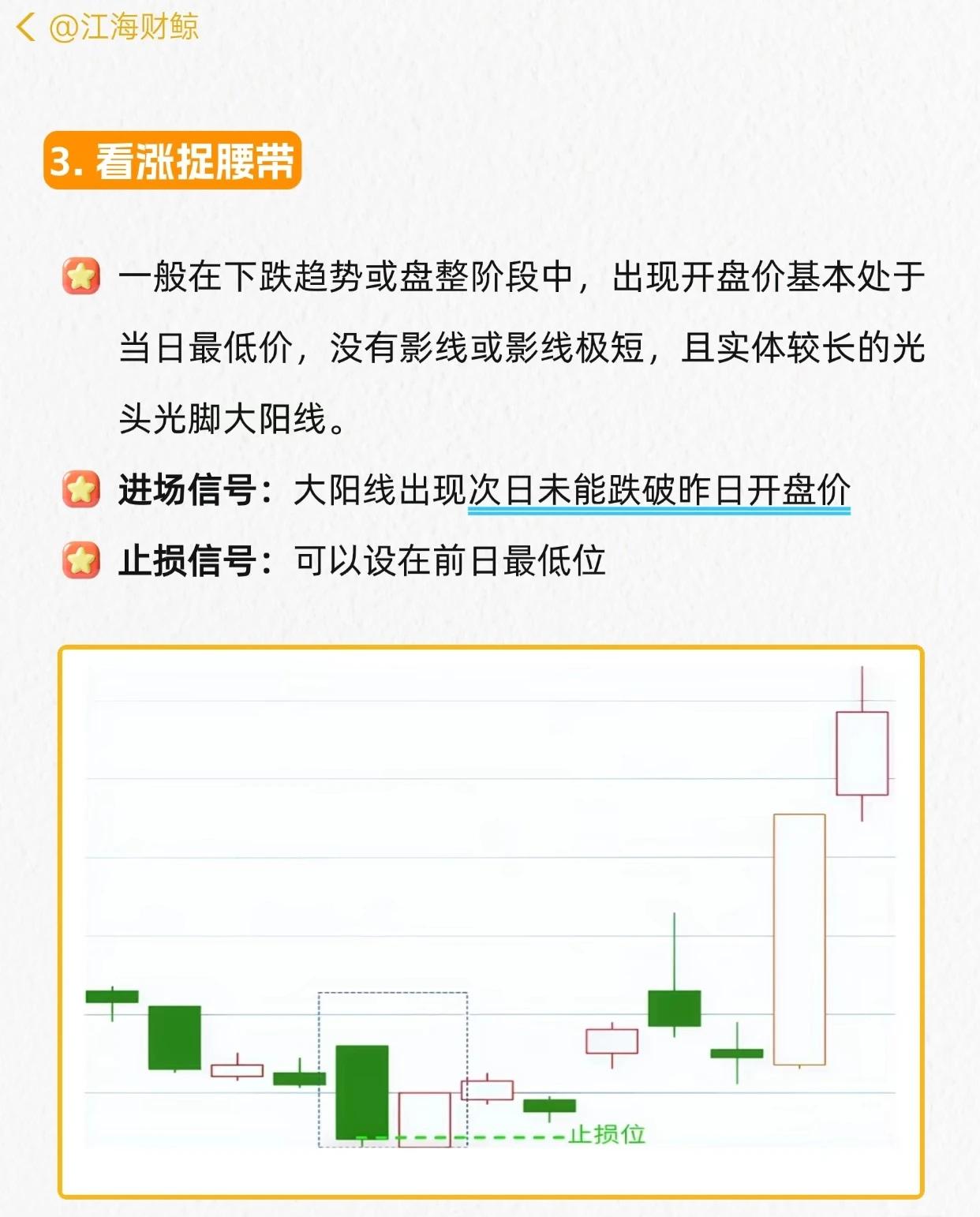 主力最怕的6个起涨形态的核心总结(均为下跌趋势中的看涨反转信号): 1. 看涨吞没:前阴后阳两根K线,阳线实体吞没阴线实体→次日不跌破阳线实体进场,止损阳线最低点。 2. 启明之星:下跌底部,长阴线+星线+大阳线(阳线上端入阴线实体)→星线次日上涨越阴线实体进场,止损星线最低点。 3. 看涨捉腰带:下跌/盘整中,开盘近最低、无/短影线、长实体的光头光脚大阳线→次日不跌破昨日开盘价进场,止损前日最低位。 4. 低位十字星:下跌中实体小、上下影长的“十”字K线→三日内不跌破实体进场,止损十字星最低点。 5. 低位倒锤:下跌中上影长、下影短的倒锤线→次日阳线实体越倒锤实体进场(上涨趋势出现则观望),止损倒锤最低点。 6. 低位锤形:下跌中下影长(≥实体2倍)、上影短/无的锤子线→三日内不跌破实体进场,止损锤形最低点。 所有形态均以对应条件满足为进场信号,形态最低点设止损,核心逻辑是“下跌趋势中捕捉反转起涨点”。