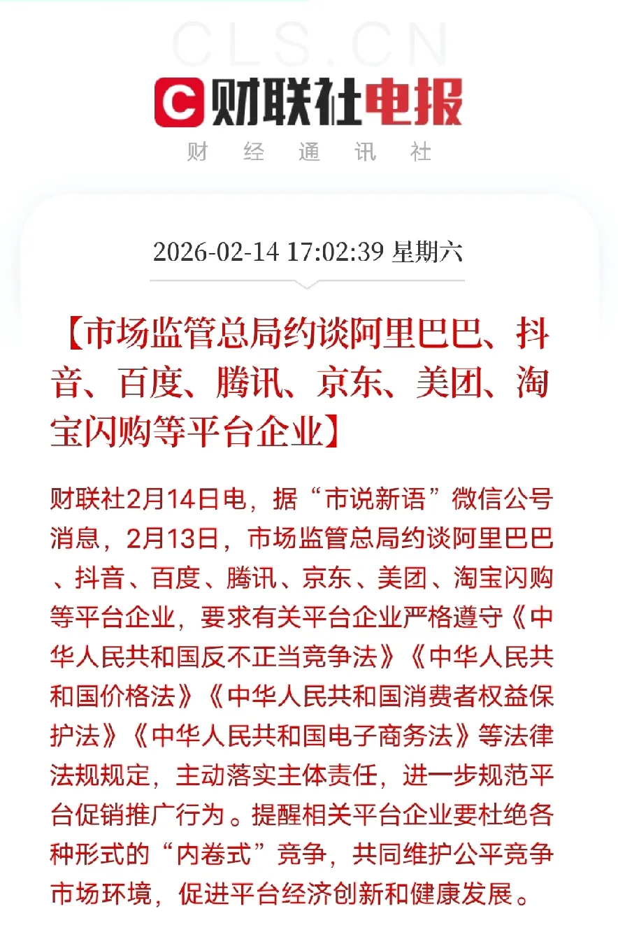 监管重磅出手!7大平台被约谈,“窝里斗”时代彻底结束2月13日,市场监管总局icon集中约谈阿里、抖音icon、百度icon、腾讯icon、京东、美团icon、淘宝闪购icon7家头部平台,明确叫停“内卷式”竞争icon,规范促销与推广行为。这不仅是合规提醒,更是行业发展方向的关键转向。过去不少平台陷入低价内卷、流量内耗、恶意竞争,大量资金与人力消耗在内部博弈,既伤害商家与消费者,也拖累技术创新。监管此举,就是要把资源从“抢存量”拉回“做增量”的正轨。对内有序竞争,对外协同开拓,才是长久之计。平台应把精力放在技术升级、服务优化与生态共建上,减少内耗、聚焦创新。无序内卷已行不通,公平合规、价值竞争,才是平台经济高质量发展的核心逻辑。