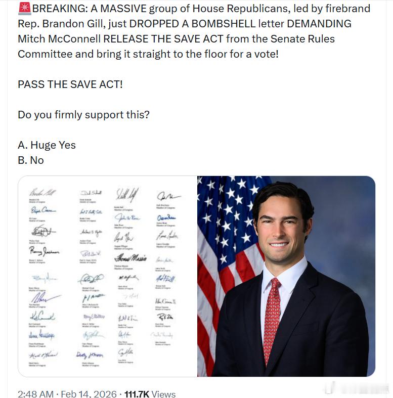 由国会议员布兰登·吉尔带领的一大批众议院共和党人,发出一封重磅信函,强烈要求米奇·麦康奈尔将《拯救美国法案》从参议院规则委员会直接送到参议院全体会议进行投票!