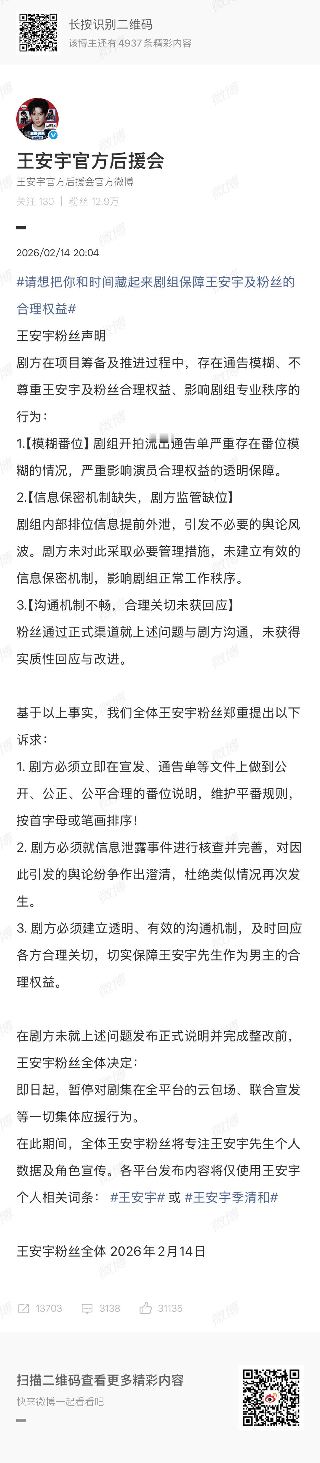 王安宇后援会向《想把你和时间藏起来》剧组维权
