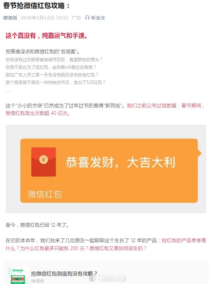 【微信产品经理回应抢红包攻略微信红包金额是实时产生的随机数】抢红包到底有没有最佳手气攻略?微信支付产品经理飞哥表示,红包的金额都是服务器实时产生的随机数,没有任何的既定规律,所以大家在抢的过程中,要手快一点,要能抢到,这才是最重要的事情。春节期间微信红包发出超40亿次