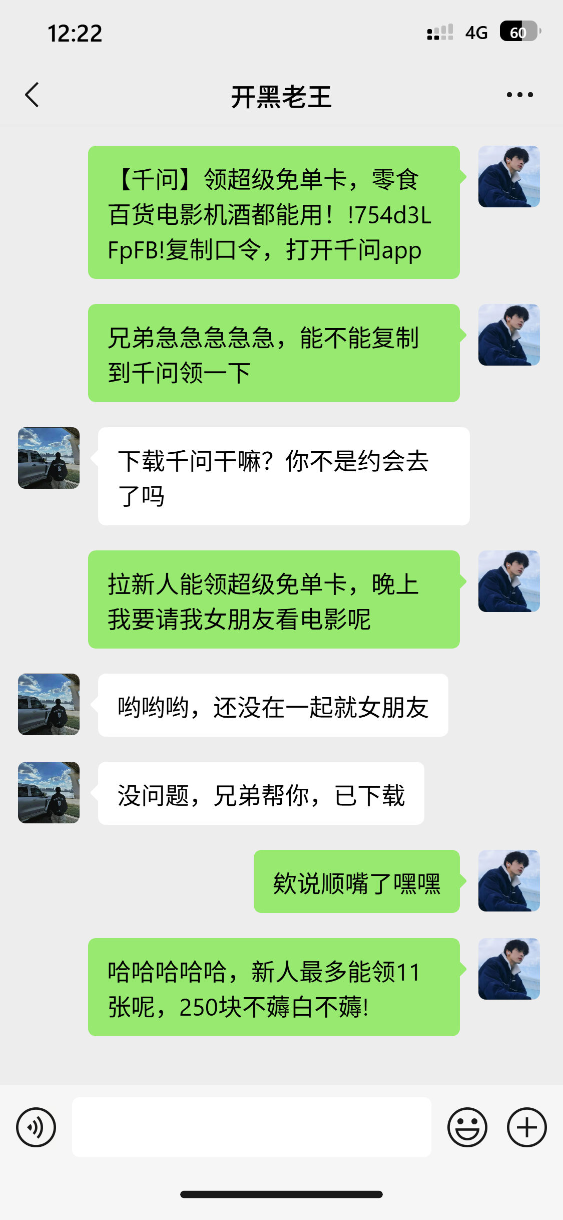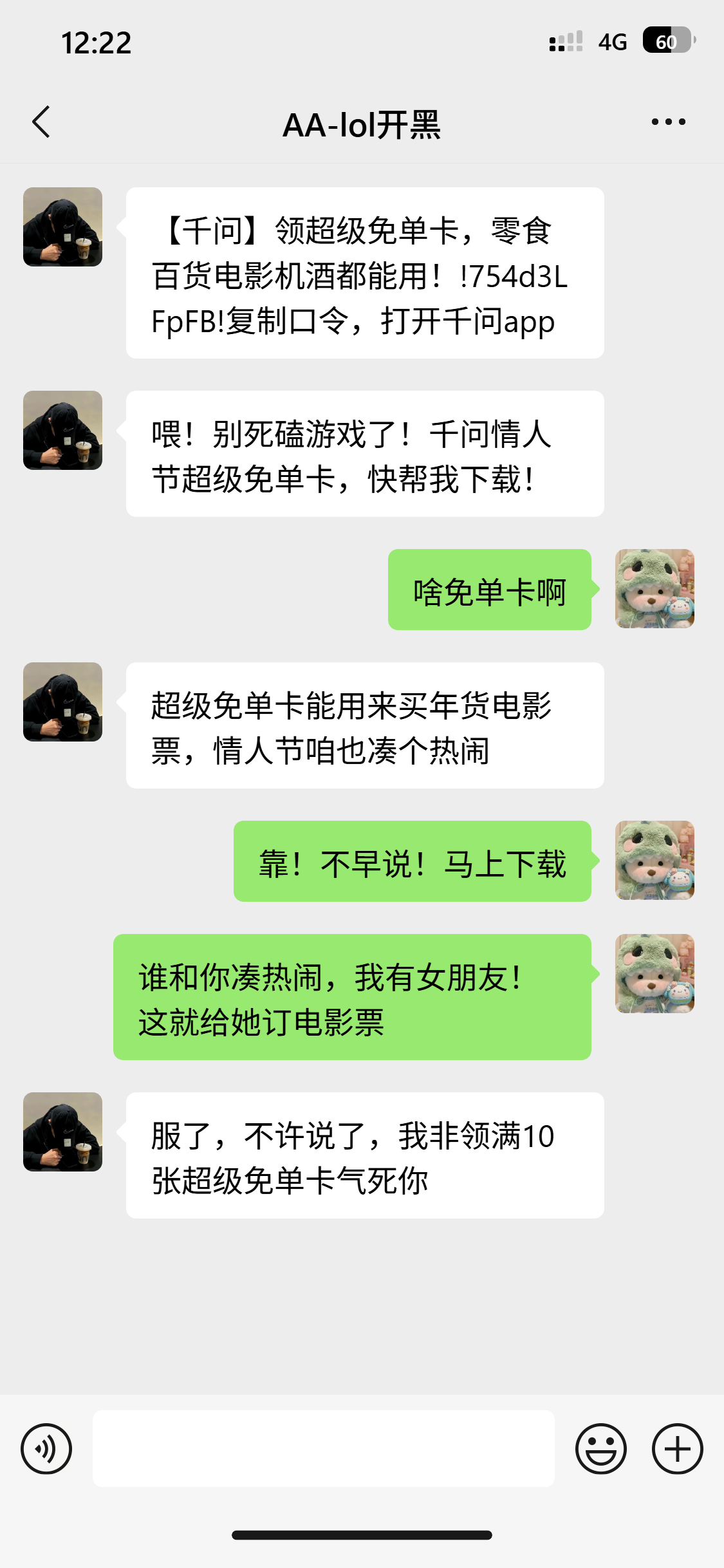情人节发现男朋友联系高中女同学 和游戏CP情人节面基,他全程热情,但总时不时瞄手机。我心里一沉:难道我是他鱼塘的一条?我(不该但忍不住)瞥了一眼他亮着的手机……屏幕上竟然是千问超级免单卡邀请?他还和我不好意思地解释:“那个…想多攒张卡,晚上请你看电影。” 行,这波操作,我甘之如饴。千问超级免单卡能买年货能买票千问超级免单卡再加3天