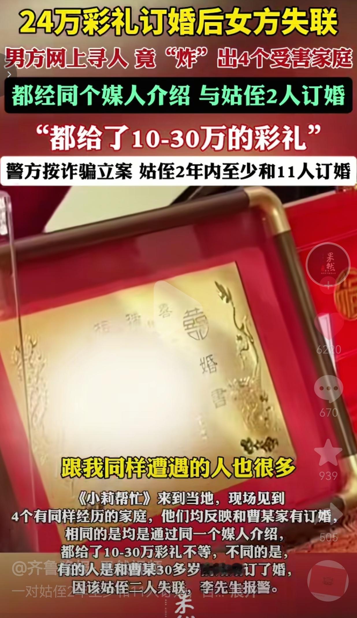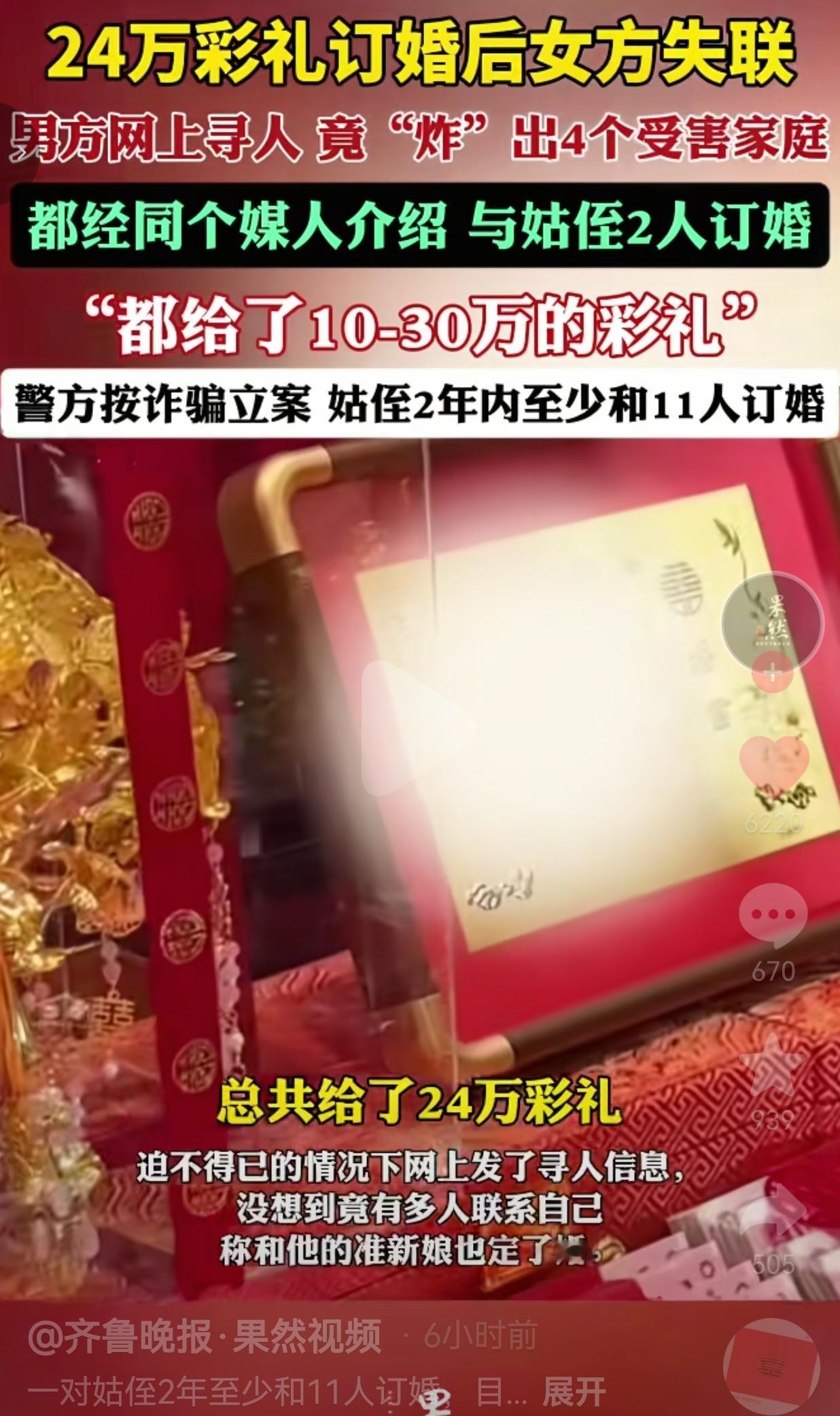 真的是丧良心!2月13日,河南周口太康的李先生反映,2024年经媒人介绍,认识了一个18岁的姑娘曹某。 俩人聊得挺好,很快就到了谈婚论嫁的地步。为了娶媳妇,李先生一家人家咬着牙,给女方凑了24万的彩礼,风风光光地把婚订了。 可谁能想到,钱刚给出去没多久,这位准新娘就像人间蒸发了一样,电话不接,微信不回,彻底失联了。 李先生一家人知道后,急得团团转。这24万,可能是父母一辈子的积蓄,是东拼西凑借来的血汗钱啊!实在没办法,他只能在网上发了寻人启事,想碰碰运气。 这一发,可不得了,直接“炸”出了4个和他一样的受害者家庭! 原来,这些“难兄难弟”都是通过同一个媒人介绍的,有的是和曹某订的婚。 有的甚至更离谱,是和曹某30多岁的姑姑订的婚!每个人都给了10万到30万不等的彩礼,然后,这姑侄俩就用同样的套路,拿钱跑路了。 目前警方已经按诈骗立案,调查结果更是让人瞠目结舌:这对姑侄,在短短两年时间里,竟然至少和11个男人订过婚! 此事引发网友的热议,有的网友说:“这哪是找媳妇,这是找了个诈骗团伙啊!” 也有的网友说:“真的是可怜天下父母心,一辈子的积蓄就这么没了,换谁能受得了?” 还有的网友说:“媒人也不是好东西,明显就是一伙的,必须严惩!”  看到这儿,我心里真是五味杂陈。 一方面,是对这对姑侄和那个黑心媒人的愤怒。她们把婚姻当成了敛财的工具,把别人的真心和血汗钱踩在脚下肆意践踏。 你要想一想,这是11个家庭,背后是11份对美好生活的期盼,就这样被她们的贪婪和无耻击得粉碎。 另一方面,我也特别心疼这些受害者。尤其是在农村,很多家庭为了给儿子娶媳妇,几乎是倾其所有。 这几十万的彩礼,可能是父母卖了粮食、借了高利贷才凑齐的。一旦被骗,整个家庭都可能被拖入深渊,甚至有人因此家破人亡。 你们怎么能没有良心,卷钱跑路呢?  通过这件事,也给我们所有人敲响了警钟。 在婚恋这件大事上,真的不能太心急,更不能轻信所谓的熟人和媒人。 订婚、结婚前,一定要对对方的家庭背景、人品性格有充分的了解,不要被爱情冲昏了头脑。 而且,所有的转账记录、聊天记录、订婚协议,都要妥善保存,万一出了问题,这就是维权的关键。 最后希望所有的人,都能谨慎对待婚姻,每个人都要知道一个道理。那就是婚姻应该是两个相爱的人,携手共建幸福的未来,而不是一场精心策划的敛财游戏。 针对此事,你有什么看法呢?欢迎评论区唠唠。 (信息来源:齐鲁晚报.果然视频)