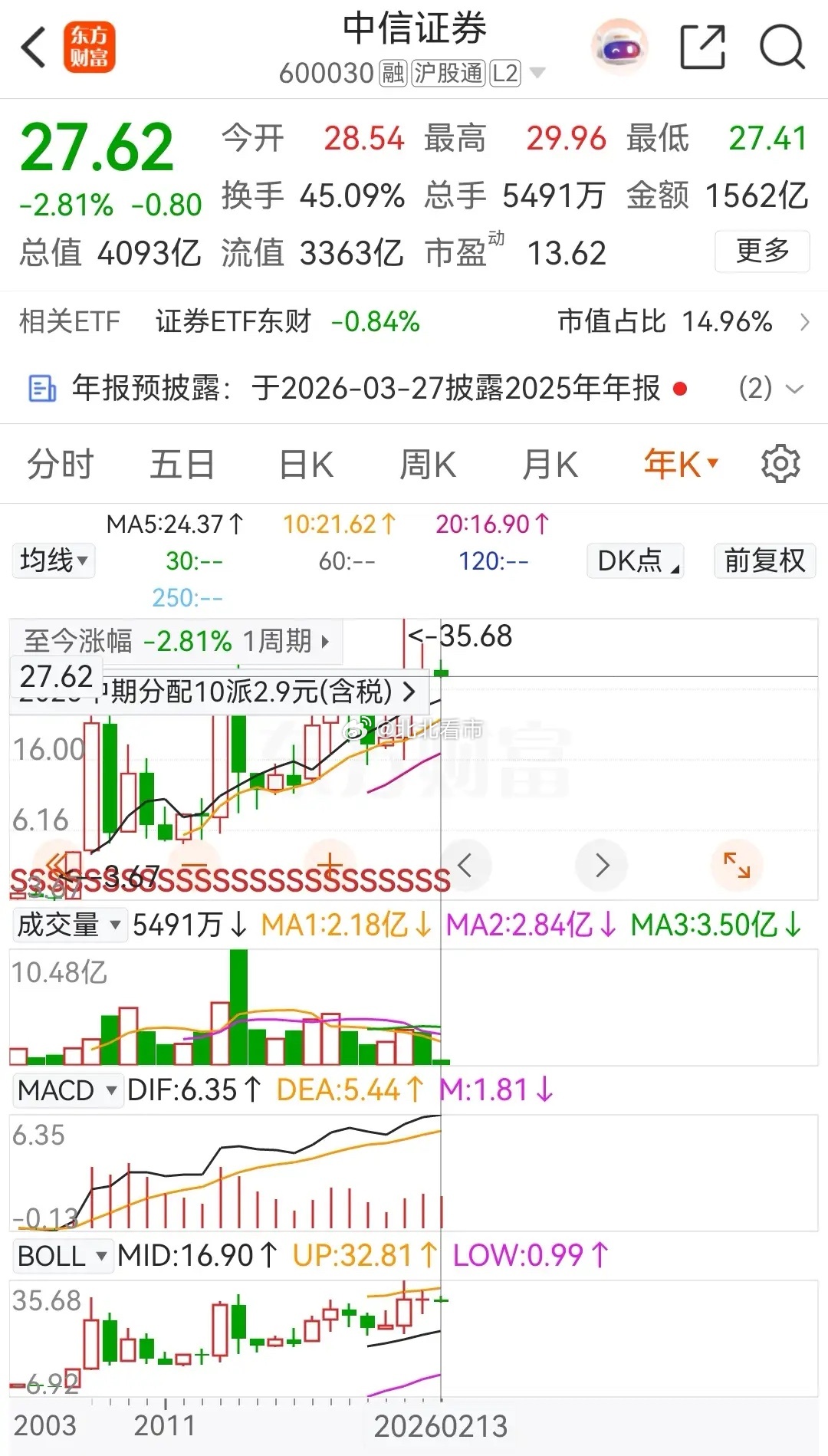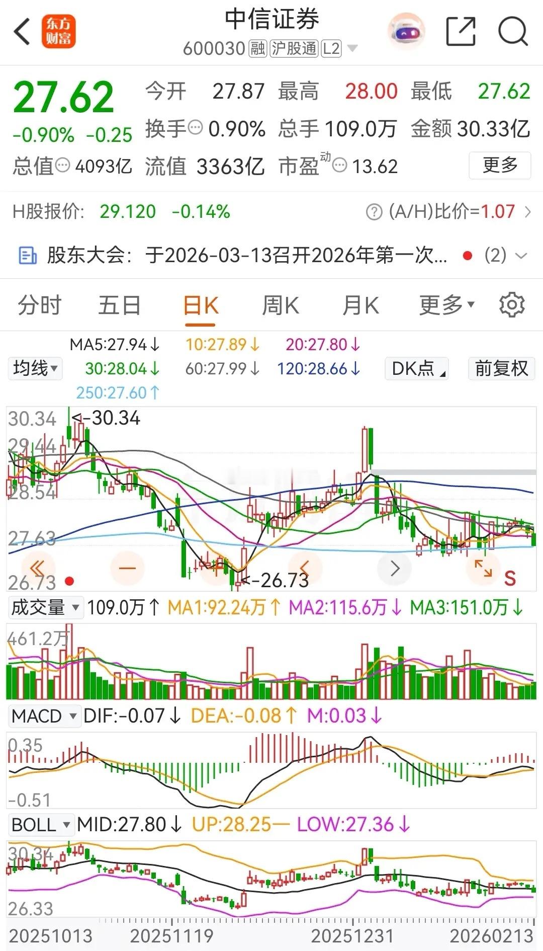 中信证券周五当天则是平开低走,收盘时跌了0.90%,收盘报价为27.62元。在资金流向上,当天被主力资金净卖出了约2.2781亿元,目前同样也是连续四天被主力资金净卖出,而本周的合计净卖出金额约为4.8419亿元。从近期的走势上看,股价连续三天下跌,在低位横盘整理了一段时间之后,目前再次拐头向下,跌到了年线处。截止当前,中信证券的总市值为4093亿元,比券茅东方财富要高些,在2026年里则是累计下跌了2.81%。