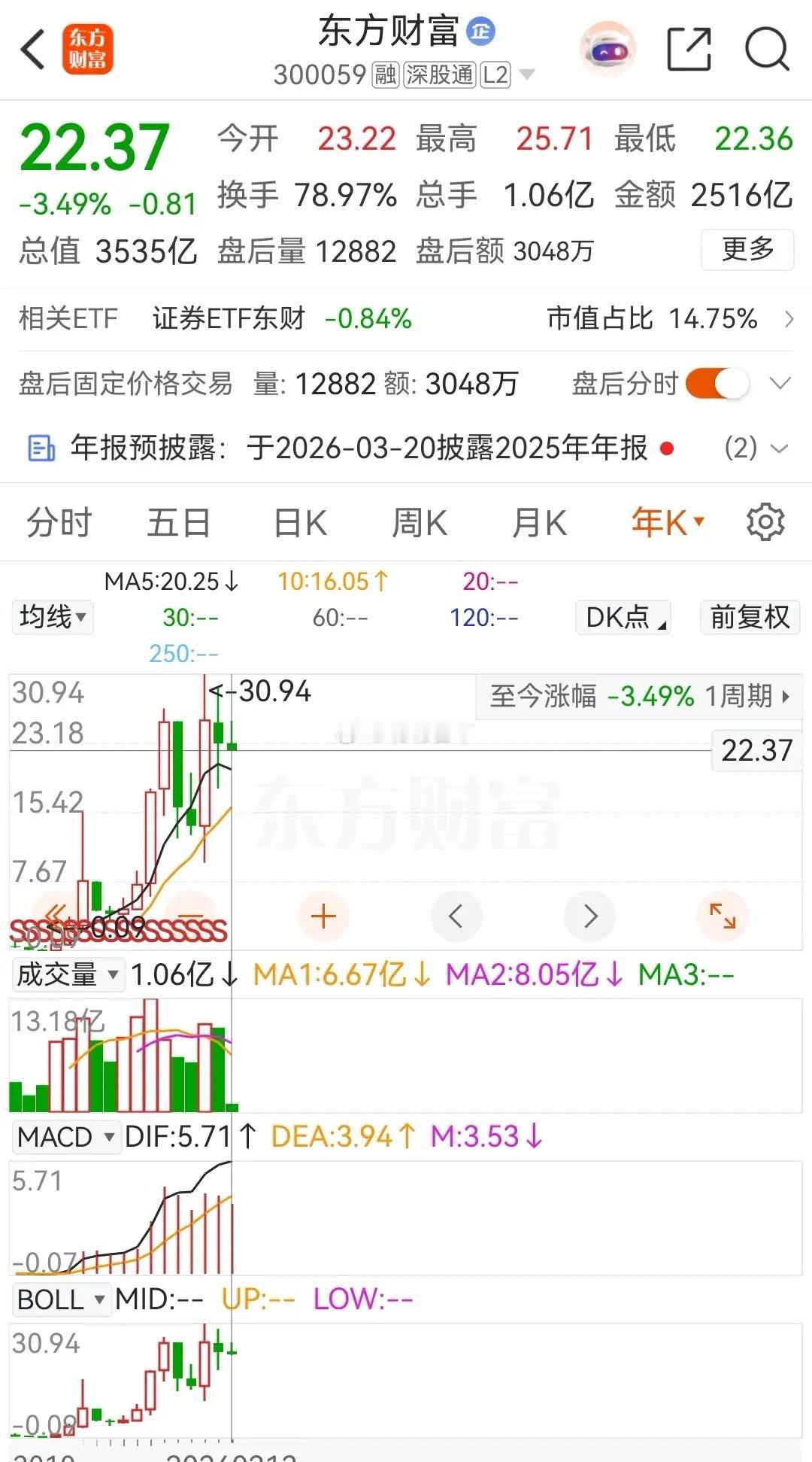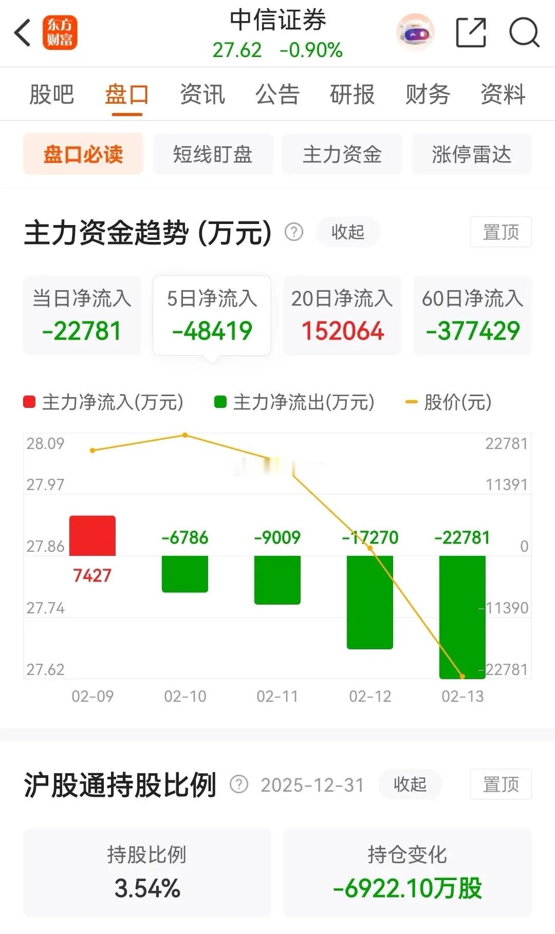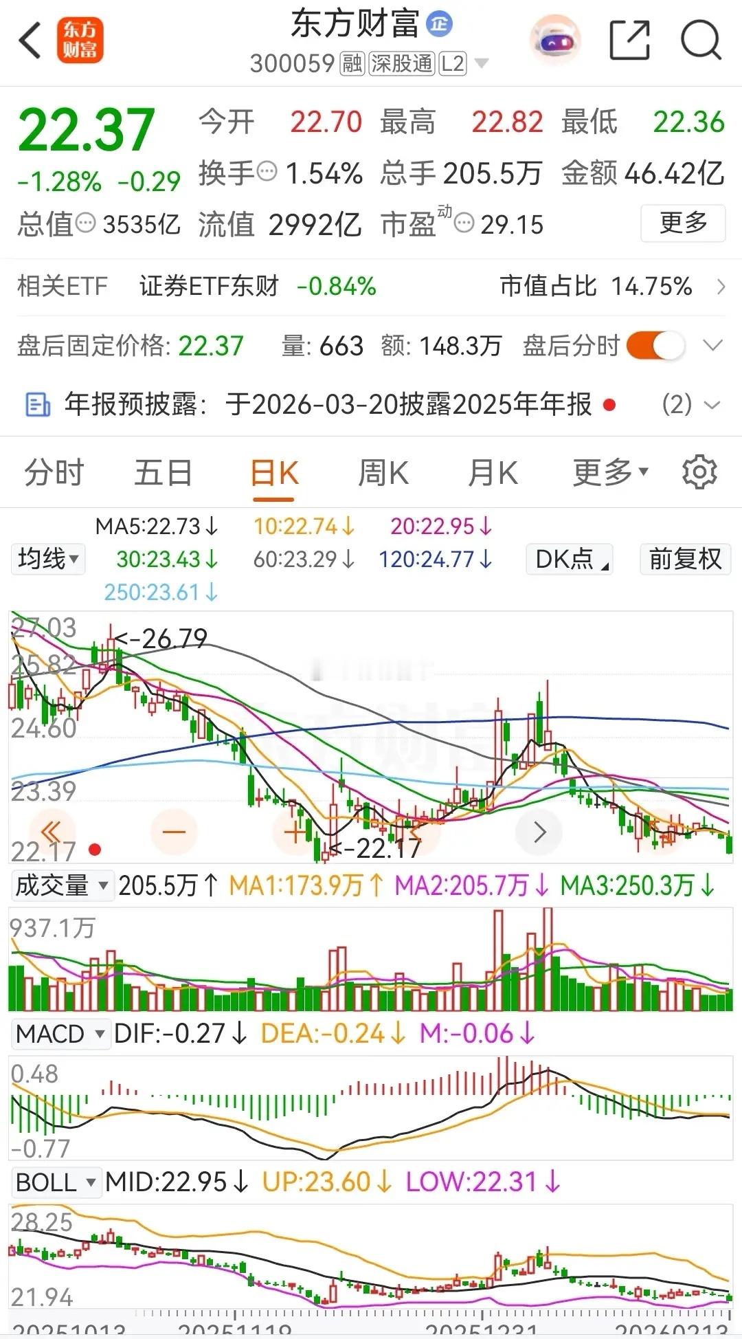 东方财富连续四天下跌,中信证券连续三天下跌,且都被主力资金连续四天净卖出,在2026年双方分别下跌了3.49%和2.81% 。东方财富本周五小幅高开后走低,尤其是到了午后,下跌速度进一步加快,收盘时跌了1.28%,报价22.37元,当前的总市值为3535亿元。在资金流向上,当天被主力资金大幅净卖出了约8.2337亿元,目前已是连续四天被净卖出了,而本周的合计净卖出金额约为14.3422亿元 。从走势上看,目前是连续四天下跌,股价处于破位下行态势之中。截止当前,东财在2026年则是累计下跌了3.69% ,要比一哥中信证券跌得多一些。