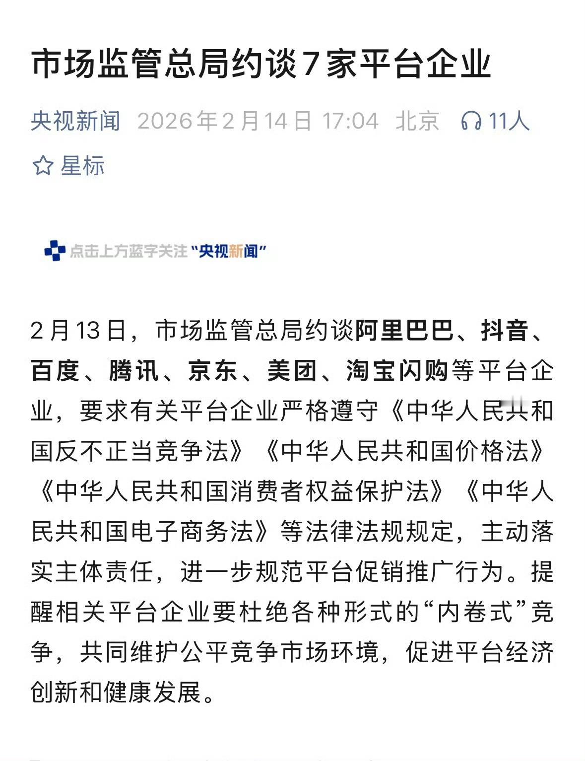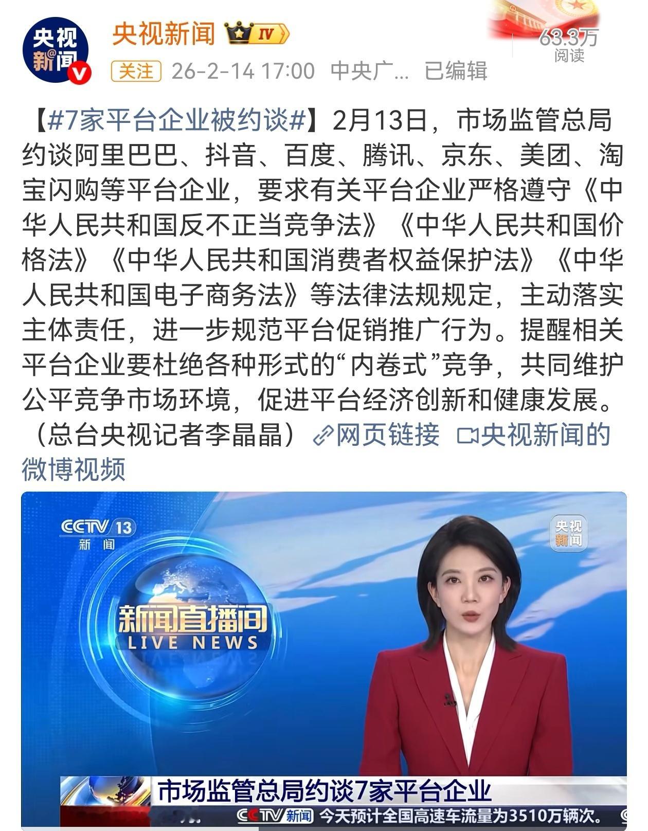 2月13日,市场监管总局约谈了阿里巴巴、抖音、百度、腾讯、京东、美团、淘宝闪购等平台企业,针对平台经济“内卷式”竞争乱象进行集中治理。近年来,同行都在搞外卖大战、社区团购,甚至抢占AI赛道,拼多多始终专注电商行业,有种外人看不懂的清醒感。7家平台企业被约谈满谈企业
