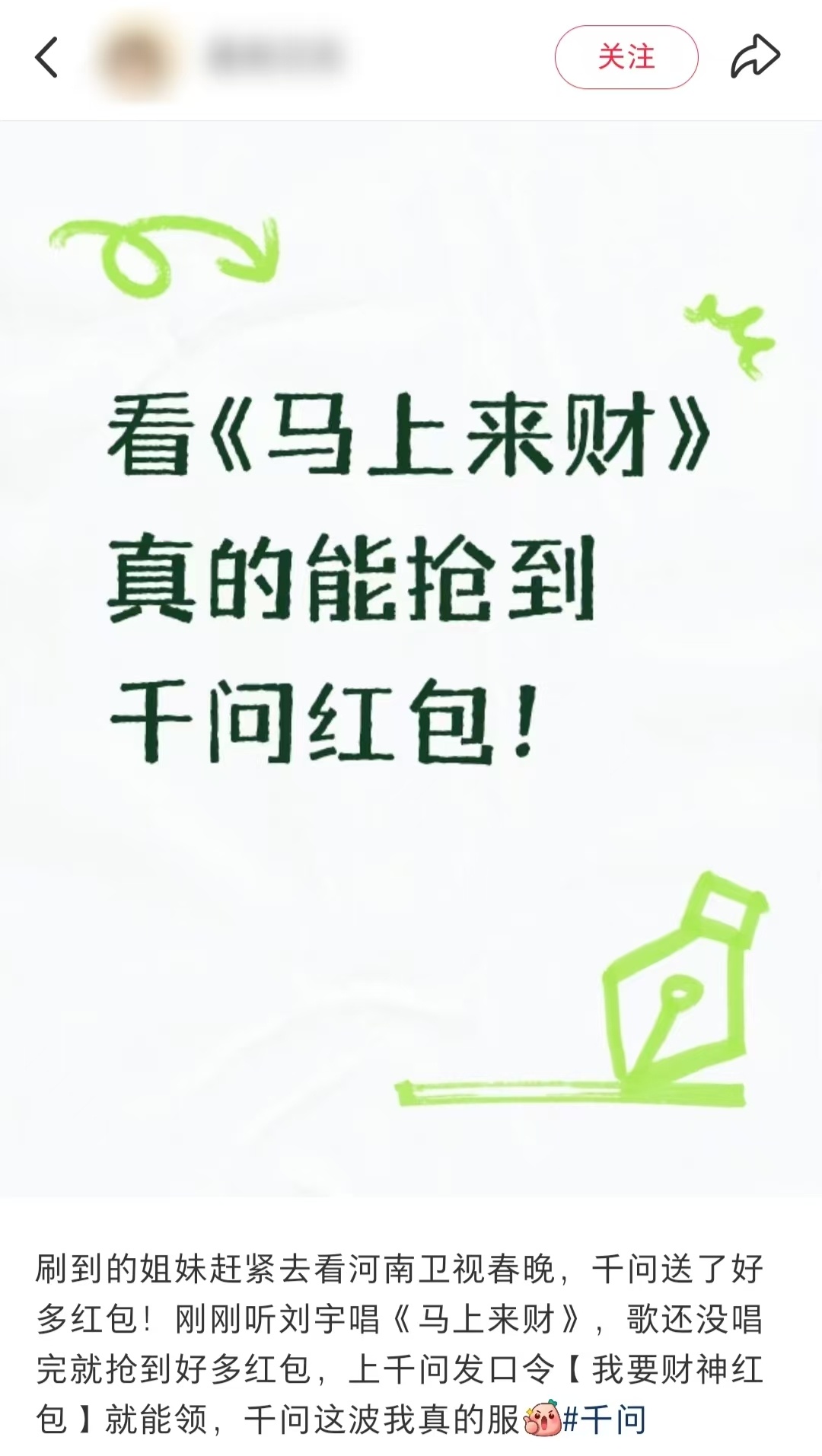 谁还没接这份好运!听刘宇唱马上来财领到千问红包看完马上来财, 歌声甜、红包香,喜气直接拉满,接完财运一整年顺顺利利,暴富就在此刻!