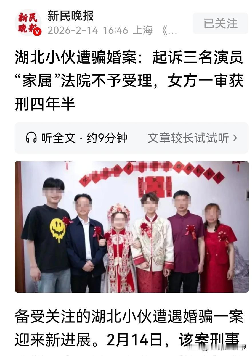 湖北随州,26岁男子网上偶遇富家女,花14.8万的彩礼和女方结婚,女方陪嫁了46万的存单、100克金条、一辆奔驰车。男方在一个偶然的机会,发现女方的不但陪嫁全部是假的,就连女方的父母、亲属、也全部是请演员扮演的。男方愤怒报警,经查明,这是一场彻头彻尾的骗婚。最终,法院这样判了! 2024年5月,随州农村,26岁的申明家张灯结彩,办了场热热闹闹的婚礼。 新娘子尹霞31岁,比申明大几岁,申明家不嫌弃,实打实给了14.8万彩礼。 女方那边也大气,陪嫁一张46万的存款单、一根100克金条、一辆奔驰车。 农村人娶媳妇,这排面可够大的,一时轰动了附近村庄。 不料,婚后没几天,新娘发脾气闹着要回青岛娘家。 申明同意她回去,但彩礼得留下。 这时候“丈母娘”打来电话圆场:让霞霞带彩礼回去,车子、存单、金条全留下,这下你总该放心了吧。 申明寻思着岳母都发话了,也就同意了。 可新娘子人这一走,就再也没回来。 申明开始觉得不对劲了,他去查了车牌,发现奔驰汽车是租车行的。 他心里一惊,回忆和女方从认识到结婚的种种疑点,感到大事不好。 申明拿着存单跑去银行,柜员一看就是假的。 在看陪嫁金条,更别提了真假了,原来就是个塑料芯子刷的金漆。 申明气炸,直接去了青岛,他去查尹霞户口,结果可想而知,查无此人。 两年多的恋爱、一场婚礼、十几万彩礼,原来是一场空。 连婚礼上的岳父岳母、大舅哥,都是花钱请的演员。 这事得从2022年5月说起。 申明在短视频平台上,认识了尹霞,不久他们在青岛见面,并发生了关系。 3个月后,尹霞说自己怀孕了,发了张B超单过来,申明以为自己不久后就可以当爹了。 几天后申明带尹霞回随州见了自己的父母。 父母看姑娘长得周正,说话得体,也不在乎女方比儿子大了好几岁。 临走,父母给了尹霞10001元的见面礼。 之后,申明陆陆续续给尹霞花钱,他认为,谈恋爱给女友花钱正常。 2023年1月,尹霞突然说孩子流产了,给男友发了医院材料证明,申明信了。 之后尹霞把男友哄骗到青岛同居。 在女友的出租屋,申明发现了一张身份证,名字不是尹霞,年龄也对不上。 原来尹霞实际是1989年出生的,却一直跟他说,自己是1994年的。 申明觉得,自己可能被骗婚了,他立马报了警。 经派出所调解,尹霞写了一份还款协议, 还3万元。 2023年5月,尹霞安排了假父亲来武汉,跟申明父母碰面。 亲家解释了女儿为啥有两个名字,说是历史遗留问题,把俩老人糊弄过去了。 两人的恋爱又继续谈着。 后来尹霞又说自己怀孕了,但再次流产,俩人开始谈婚论嫁。 申明花20000元给女友买了钻戒,并求婚成功。 中间两人吵过架分过手,又和好,一直分分离离的。 2024年1月,尹霞又寄来张B超单,说自己又怀了。 还找了个情感博主,冒充假扮自己哥哥,出面调解俩人的感情,催着结婚。 2024年5月,俩人“奉子成婚”。 婚礼在随州办完,按计划得去青岛女方家再办一场。 临出发,尹霞要把14.8万彩礼现金带走。 申明父母有点犯嘀咕,这时候“大舅哥”电话打过来了,说自己家陪嫁那么多,还在乎这点彩礼吗? 话说到这份上,申明父母只好把14.8万给了。 一到青岛,尹霞把申明安排进一栋别墅,说这是她家的。 但就是见不着岳父岳母,尹霞说家里有矛盾,不方便。 几天后,尹霞交给男友一张46万存单、一根金条、一把奔驰车钥匙,说父母给的陪嫁。 可他一提正式领证,尹霞说,自己以前开整容医院犯过事,暂时没法领。 后来申明才知道,那106400元,被尹霞存进了自己卡里,剩余的积分被他她花了。 而陪嫁的存单和金条是网上买的假货,车是租的。 连那两万“改口费”,都是拿他的彩礼钱发的。 2024年5月下旬,两人回到随州,可没几天,尹霞闹着要走。 不久,申明发现,女友为了骗婚连父母、亲属都是花钱请的演员。 他忍无可忍的报警了。 经查,尹霞2015年就在山东莱州结了婚。 夫妻俩人还有个女儿,虽然分居多年,但一直没离婚。 也就是说,她跟申明办婚礼那会儿,法律上还是有夫之妇。 2024年10月,尹霞在青岛被抓获。 申明认为,尹霞的假爹妈、假哥哥都是骗局中的一员,不能就这么算了。 2025年11月,申明对3人提起了附带民事诉讼。 但法院没受理,申明不服,提起上诉。 2026年2月14日,情人节这天,申明拿到裁定书:民事诉讼,不予受理。 《刑法》第266条:诈骗公私财物,数额较大的,处3年以下有期徒刑、拘役或者管制,并处或者单处罚金; 数额巨大或者有其他严重情节的,处3年以上10年以下有期徒刑,并处罚金。 最终,法院判决:判处尹霞有期徒刑4年6个月,罚金2万,追缴89140元退给申明。 关注@赵哥的法律观,评论区留言发表你的看法。