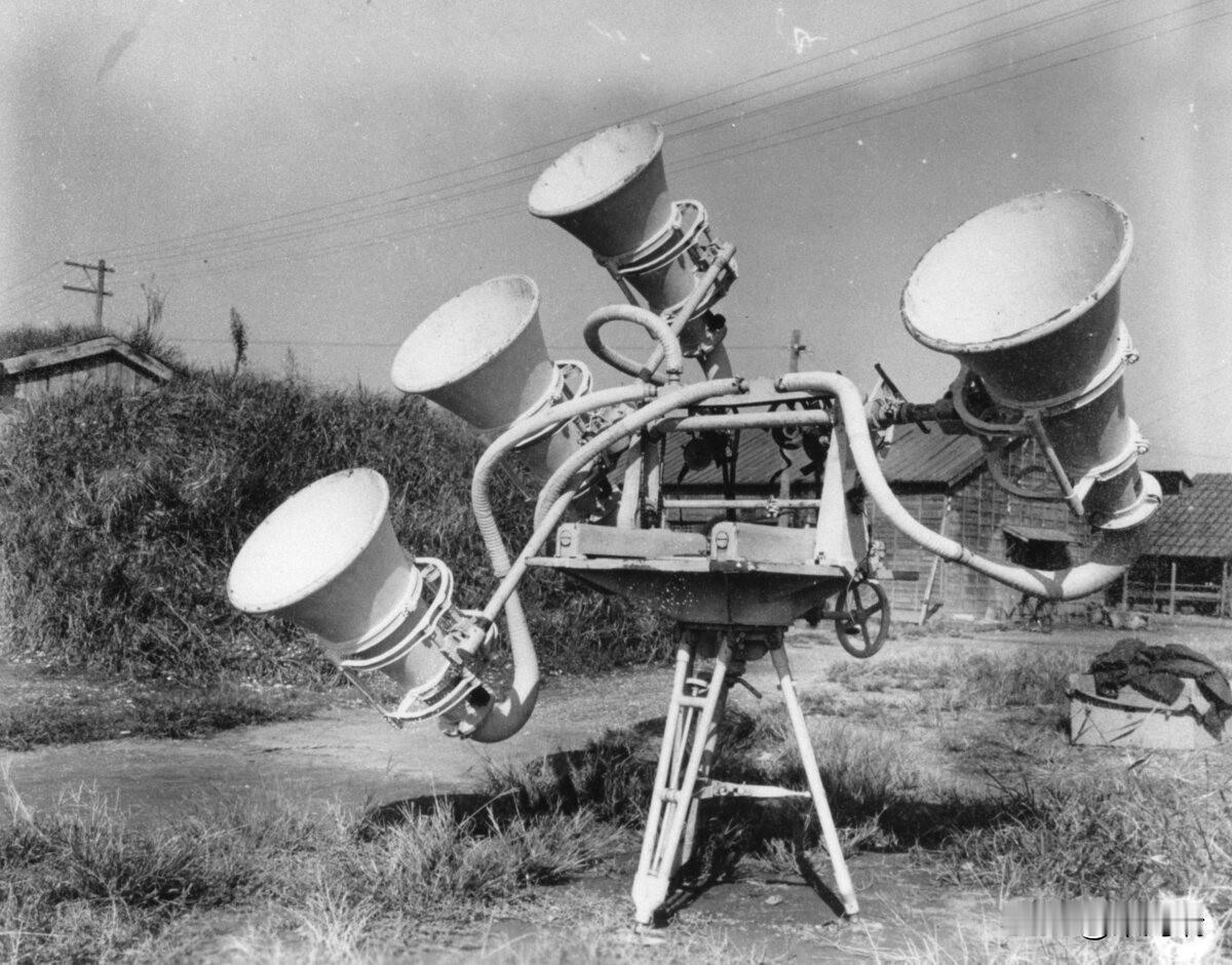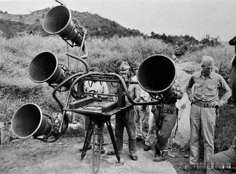 这是一种在雷达技术成熟之前,用于探测敌方飞机的声学定位器(Acoustic Locator),也被通俗地称为“战争喇叭”(War Tubas)或“听音器”。 根据历史档案,照片上这种特定型号是二战时期日军在东京郊区使用的九十式空中听音机(Type 90 acoustic radar/locator)。