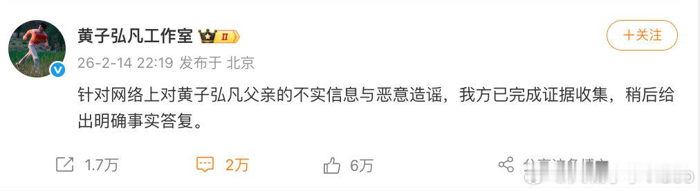 【黄子弘凡方已收集证据】 2月14日,曝黄子弘凡爸爸诈骗学生登上微博热搜,发文表示:针对网络上对黄子弘凡父亲的不实信息与恶意造谣,我方已完成证据收集,稍后给出明确事实答复。
