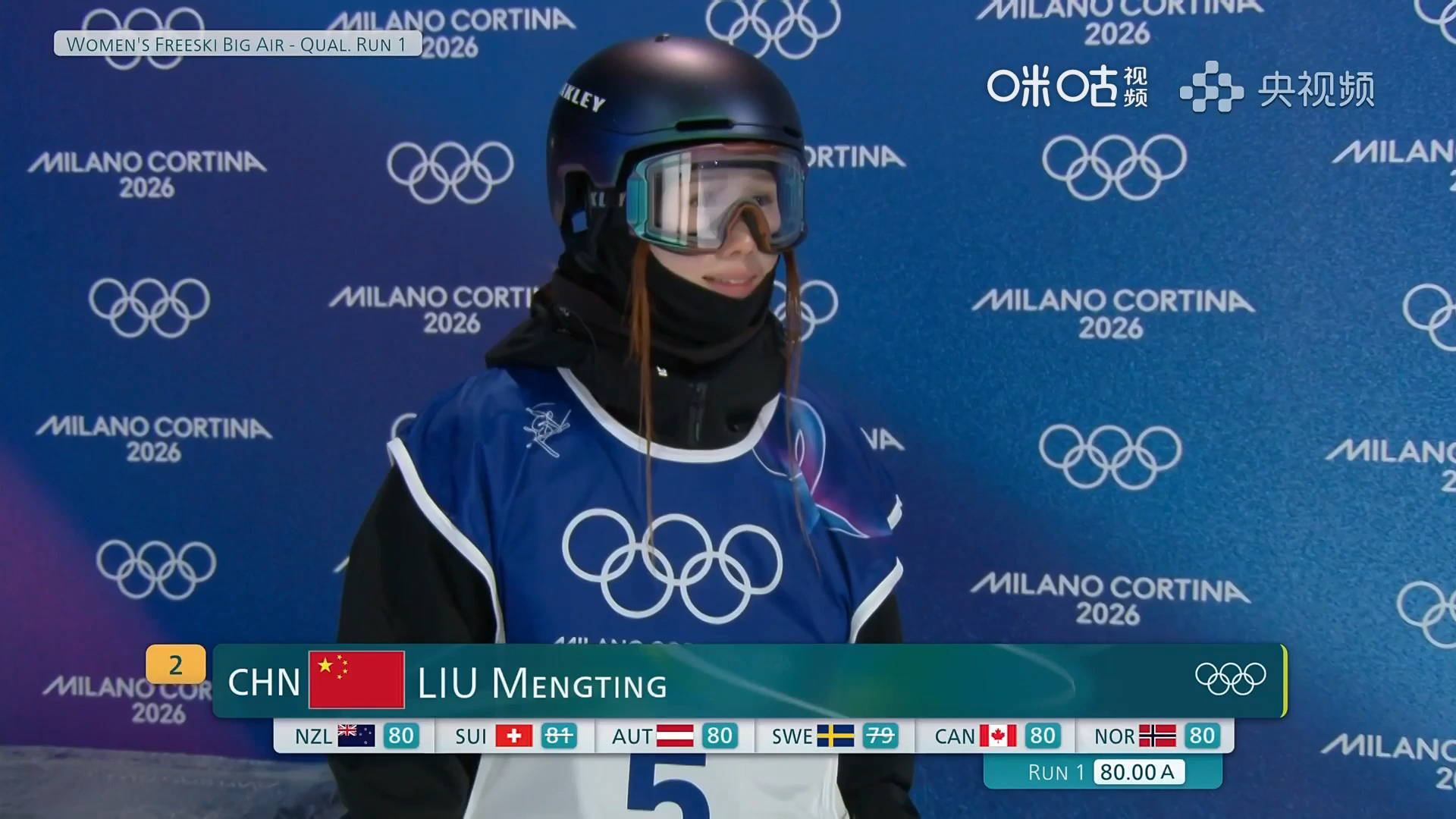 米兰冬奥会自由式滑雪女子大跳台预赛,🇨🇳第一跳:80.00分。 📺锁定为中国自由式滑雪女子天团加油助威。