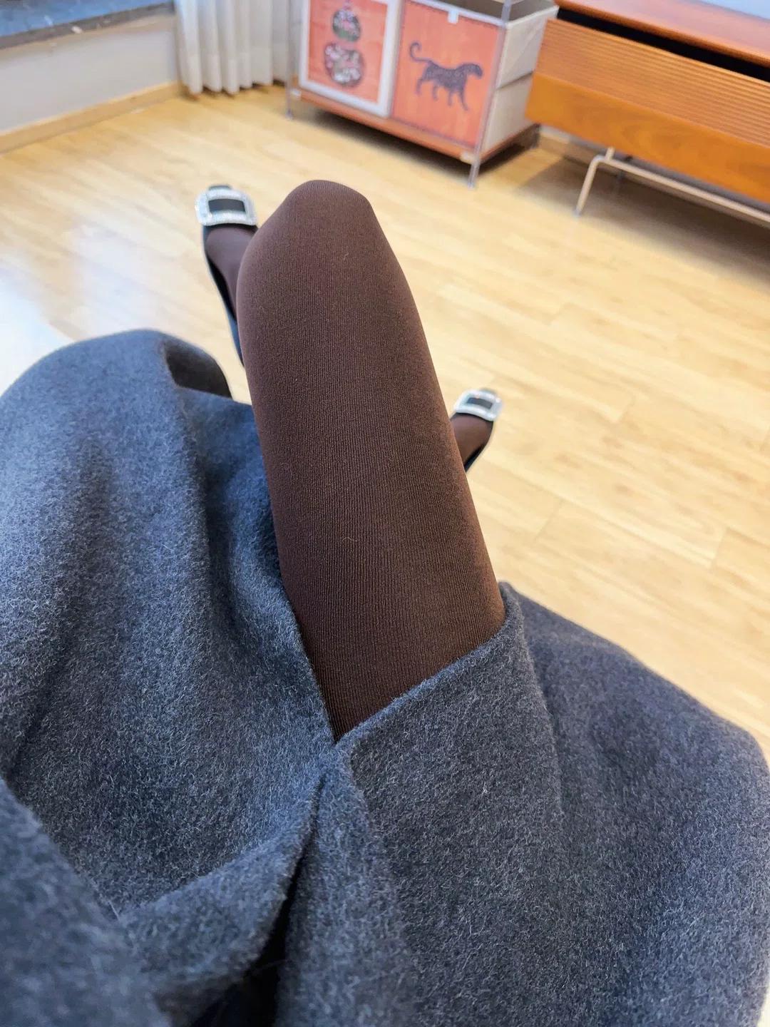 深棕连裤袜是今天的主角。 细腻的哑光面料顺着腿型延伸,把小腿线条修饰得流畅又温柔,和深灰大衣的厚重羊毛形成恰到好处的对比。 它不张扬,却在每一次抬腿、交叠时,悄悄勾勒出身体的弧度;光落在上面,泛着细腻的绒感,像把整个秋冬的温润都穿在了身上。 脚上的水钻方扣鞋,反而成了它的配角,只在脚踝处轻轻点缀,让这份质感更显高级。