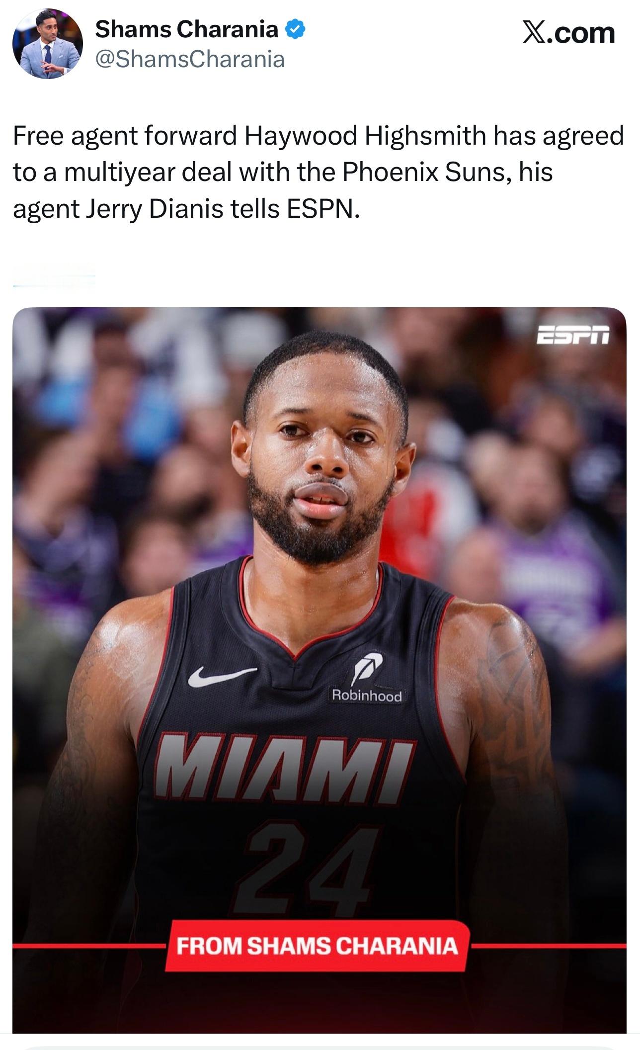 Shams:自由球员前锋海史密斯2年合同签约太阳。