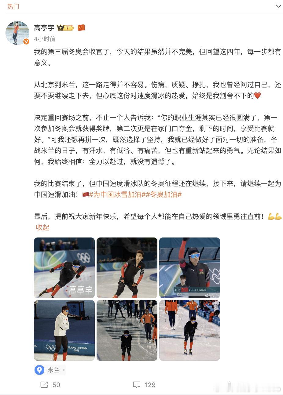 高亭宇总结第三届冬奥会【高亭宇说这四年每一步都有意义】米兰冬奥会速度滑冰男子500米决赛,卫冕冠军以34秒47完赛最终排名第七。赛后他更新个人社交媒体: