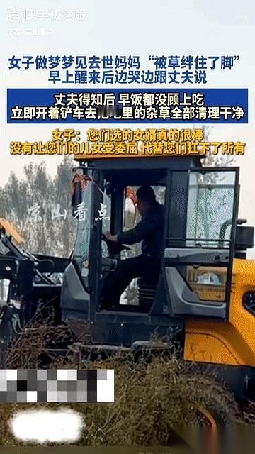 一个男人,大清早饭都没吃,直接开着铲车就出了门。 不是去工地,也不是去拉货。他要去给他过世的丈母娘,把坟头的草给清干净。 就因为半夜,他老婆突然哭醒,抓着他的胳膊,一边抽泣一边说,梦见她妈在那边,被坟上的野草绊着脚,走不动道。 他听完没说一句“这是迷信”,也没问“真的假的”,只是伸手把老婆揽过来,轻轻拍着她的背,说别怕,我去弄。 天刚蒙蒙亮,院子里那台大家伙就“轰隆隆”地发动了。男人跳上驾驶座,熟练地挂挡,升起铲斗,一脚油门就朝着山坡开过去。 到了地方,他把车停稳。冰冷的钢铁铲斗,此刻却降落得格外轻柔,贴着坟头的边缘,一铲下去,就把那些长得半人高的杂草连根带土,整个端了起来。来回几下,坟包周围瞬间变得干干净净。 他老婆就站在不远处看着。等丈夫从车上下来,她才慢慢走到坟前,对着墓碑,像在跟她妈聊天一样,轻声说:“妈,你看,你挑的女婿,没让我受一点委屈。” 什么叫嫁对了人? 大概就是你那些说不清道不明的委屈和胡思乱想,有个人,会毫不犹豫地当成天大的事来办。