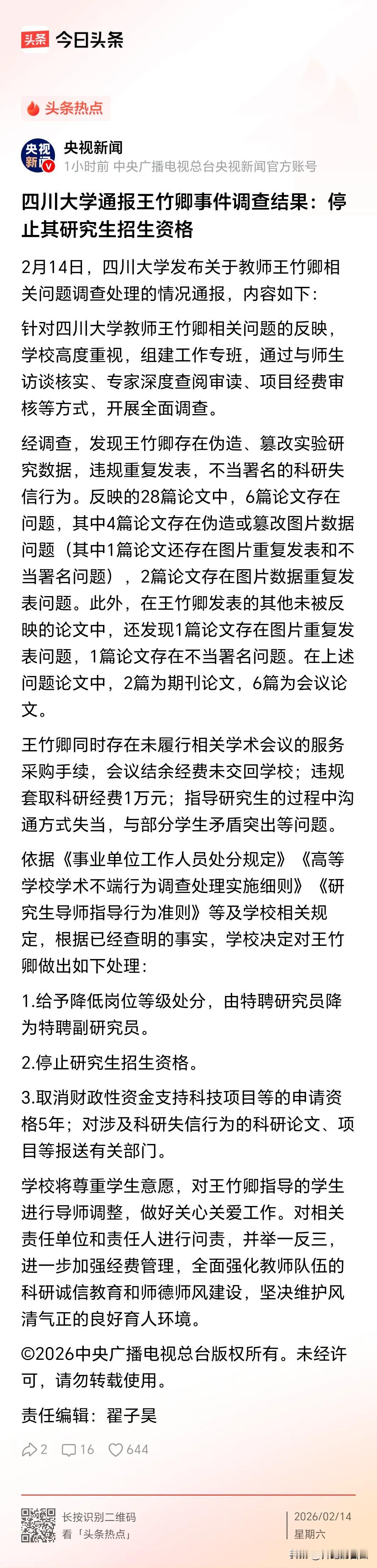 对王竹卿的处罚结果,是对学术不端的纵容 刚刚看了央视发布的对四川大学王竹卿的事件的调查通报和处理结果。终于明白王竹卿产生的根源。如此学术不端,结果却是仅降一级处理。再看通报后所谓师风建设,和“坚决维护风清气正的良好育人环境”;如此处罚怎么震慑后来者?可以预见的“张竹卿”、“李竹卿”的出现将不可避免。 此次通报明确查实王竹卿存在科研失信、违规套取科研经费、导学关系失范等多项问题,这些行为触碰学术底线,损害学生权益,也透支高校公信力,本应从严处理以正风气。 官方给出的处理仅为降低岗位等级、停止研究生招生、取消5年项目申报资格,相较于查实的多项违规行为,惩戒力度明显偏轻,难以形成有效震慑。 教育部明确要求对学术不端行为严肃查处,情节严重者可解除聘用合同,此次处理未触及最严厉惩戒,让制度的严肃性打了折扣,也让公众感到失望。 高校是学术净土,导师是学生榜样,一旦学术不端成本过低,就会有人心存侥幸,把规则当摆设,把诚信当浮云,最终侵蚀整个教育科研生态。 学生敢于集体举报、拿出详实材料维权,是对公平正义的期盼,轻罚处理无疑会寒了学子的心,也会让更多人对高校监督机制失去信心。 通报里强调加强师风建设,口号再响亮,没有硬核处罚做支撑,也只是流于形式,难以真正遏制学术不端,更无法兑现净化育人环境的承诺。 科研经费是公共资源,学术声誉是高校根基,对违规者的宽容,就是对守规者的不公,也是对公共利益与教育初心的不负责任。 过往多起高校学术不端案例显示,只有顶格处理、公开通报、终身追责,才能让心存妄念者不敢越雷池,才能守住学术圈的底线与尊严。 处罚不是目的,震慑才是关键,一次轻飘飘的降级,挡不住后续效仿者,只有让违规者付出沉重代价,才能真正刹住学术不正之风。 学术诚信容不得半点含糊,教育公平守不得丝毫松懈,高校处理此类事件,必须拿出刮骨疗毒的决心,而不是轻描淡写的安抚。 公众期待的不是形式化通报,而是动真碰硬的整改,唯有从严执纪、绝不姑息,才能重建信任,让校园回归纯粹,让学术回归本真。 轻罚养患,重典治乱,对待学术不端只有零容忍,才能守护教育的根基,才能不让坚守诚信的师生们心寒失望。 各位读者你们怎么看?欢迎在评论区讨论。