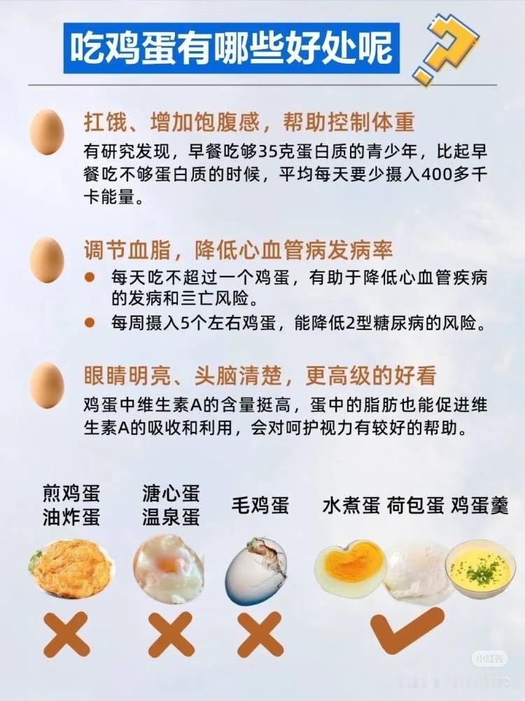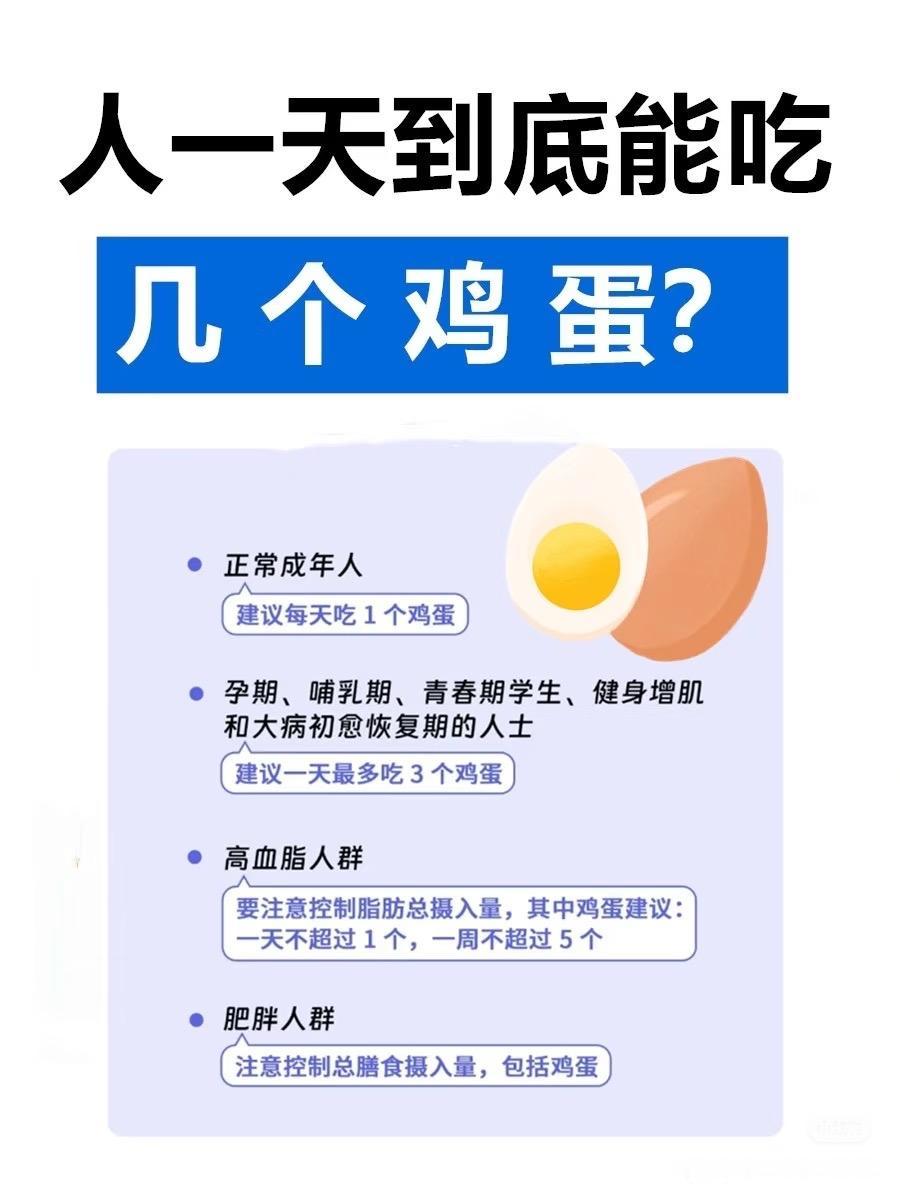 • 优质蛋白:易吸收,助力肌肉、免疫力、身体修复 • 护眼:含叶黄素、玉米黄质,保护视力 • 补脑:卵磷脂有益大脑发育与记忆力 • 营养全:含维生素A/D/E/B族、铁、硒、锌等 • 饱腹感强:控食欲,有助体重管理 一天吃几个合适 • 健康成年人:每天1个全蛋很稳妥 • 健身/青少年/孕妇:可每天1~2个 • 血脂、胆囊、肾病等问题:遵医嘱,一般建议每天不超1个或只吃蛋白