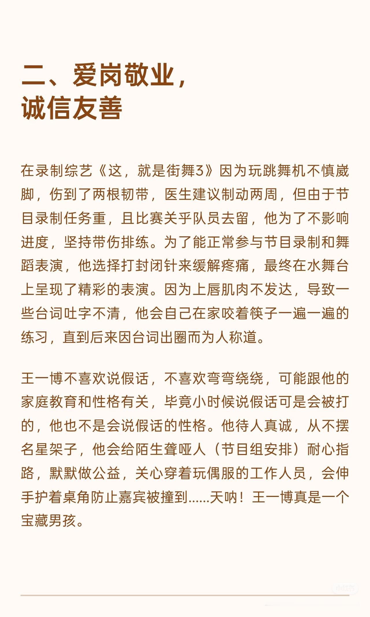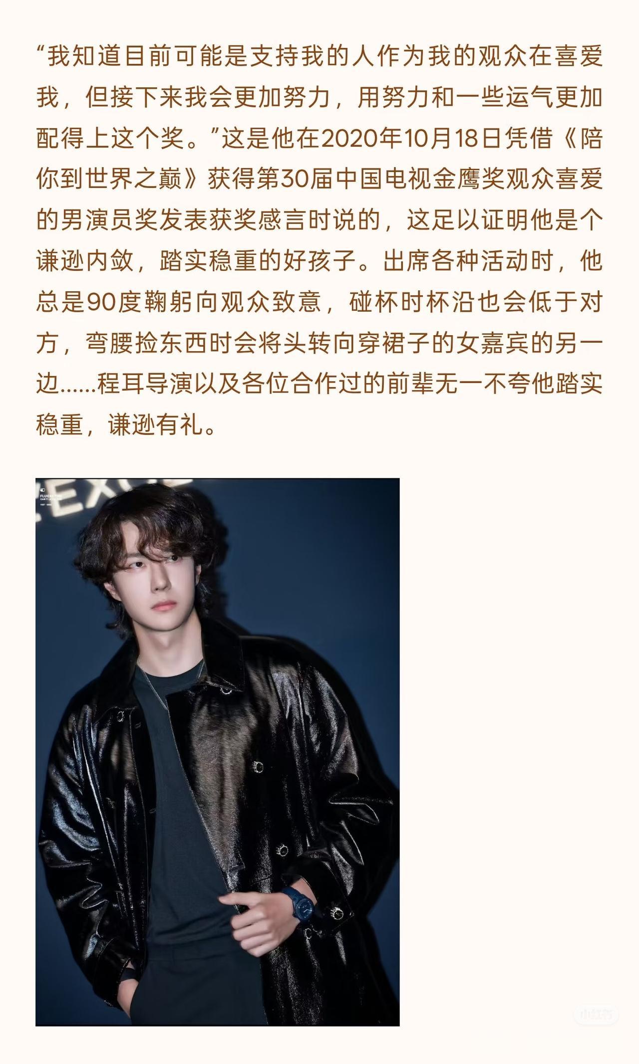 • 对前辈:主动给汪涵换安全位置、游戏中让着李冰冰、替韩庚受罚 • 对他人:颁奖礼主动让C位、递花、让话筒,维护外籍嘉宾尊严;捡国旗、帮工作人员擦水渍、收拾垃圾 • 对粉丝/团队:不摆架子,工作结束鞠躬致谢,守时高效、不折腾人 二、真诚通透,不装不作的真实 • 话少但实在,采访不迎合、不立人设,不会就直说“不会” • 不被流量绑架,不拍戏就“消失”,专注拍戏、练舞、赛车、攀岩 • 素颜出镜、直面高原反应,用真实对抗娱乐圈浮躁 三、敬业专注,用实力说话 • 拍戏高难度动作亲自上,反复打磨角色,业内公认刻苦认真 • 对专业较真:纠正品牌读音、核对滑板术语,排练到凌晨调音效 • 跨界都做到极致:街舞、赛车、摩托、滑板,全是长期苦练的结果 四、善良共情,低调做实事 • 公益:河南洪灾捐300万+带伤赴一线搬物资,全程低调无宣传 • 环保/公益大使:赴西藏冰川、拍穿山甲保护纪录片,用影响力做正向事 • 细节暖心:给聋哑人手写指路+加油、照顾视障观众感受 五、清醒自持,有原则有底线 • 面对赞誉不骄,面对批评虚心改,始终自我认知清晰 • 有边界感,不刻意讨好,也不冷漠,用行动而非话术表达善意 • 立场坚定:早年在韩明确强调“我是中国人”,爱国体现在日常细节