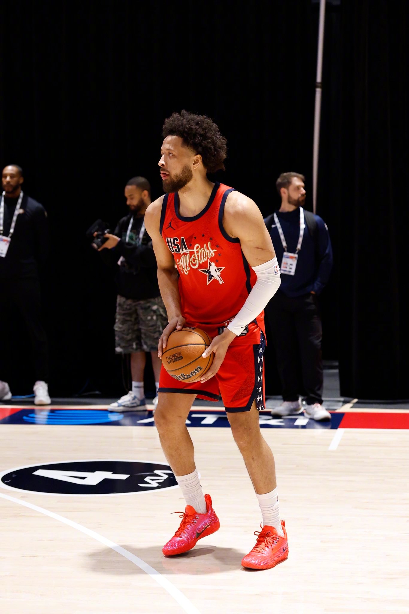 坎宁安在今天媒体日上上脚了一双全新鞋款Nike ST Charge。坎宁安这双也有说法,鞋舌有Logo、后跟有球衣号码,而这个配色也是呼应全明星的Warning Label主题。2026NBA全明星球鞋很潮