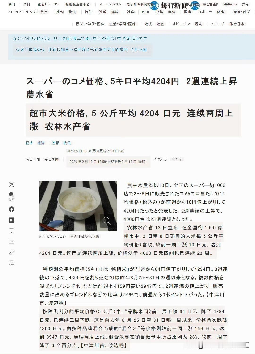日本新闻,日本超市大米价格 5 公斤平均 4204 日元(约189人民币),连续